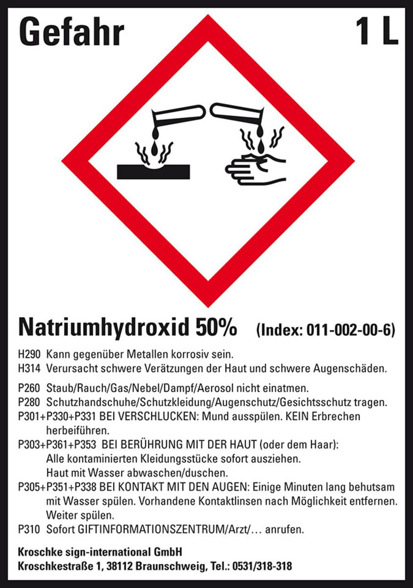 KSIGN Gefahrstoffetikett Text und Symbol nach Wunsch Natriumhydroxid 50 %