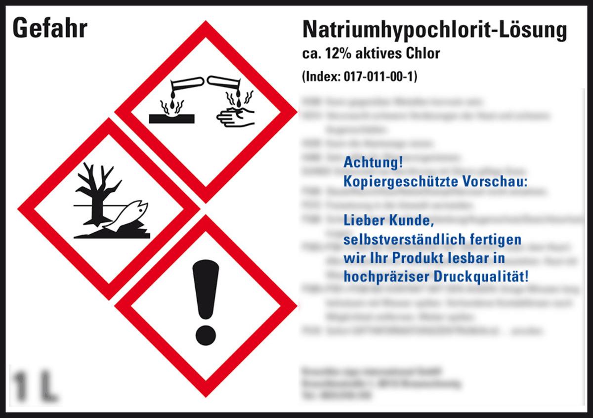 Auswahl: Gefahrstoffetikett Natriumhypochl.ca.12% akt.Chlor, nach Wunsch, GHS/CLP, 105x74mm, 8/Bogen