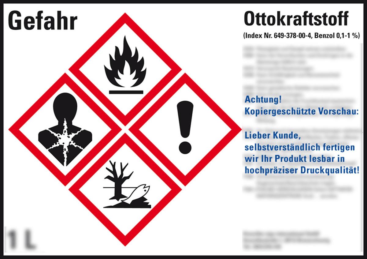 Auswahl: Gefahrstoffetikett Ottokraftstoff, nach Wunsch, GefStoffV/GHS/CLP, Folie, 105x74mm, 8/Bogen