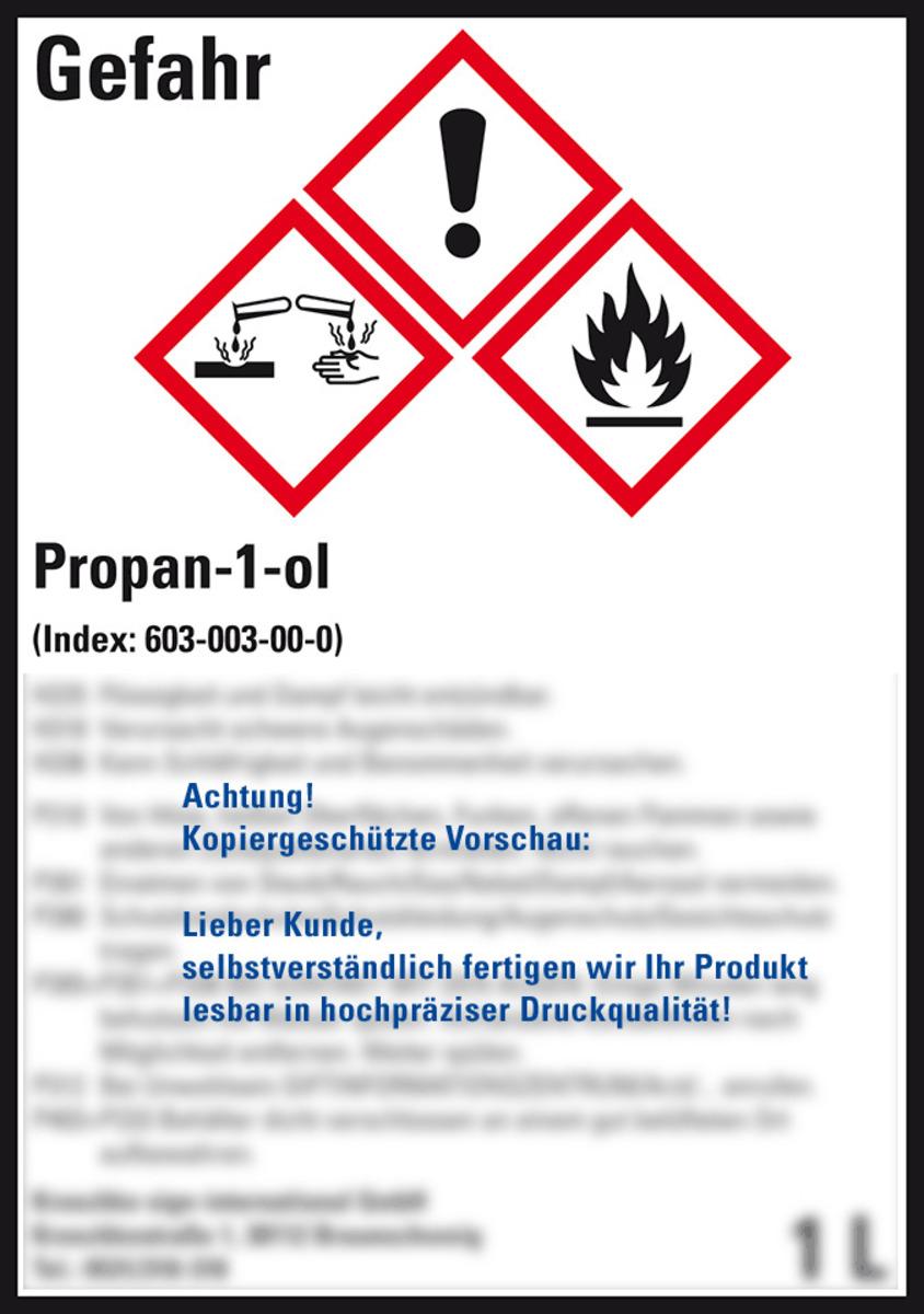 Auswahl: Gefahrstoffetikett Propan-1-ol, nach Wunsch, GefStoffV/GHS/CLP, Folie, 52x74mm, 10/Bogen