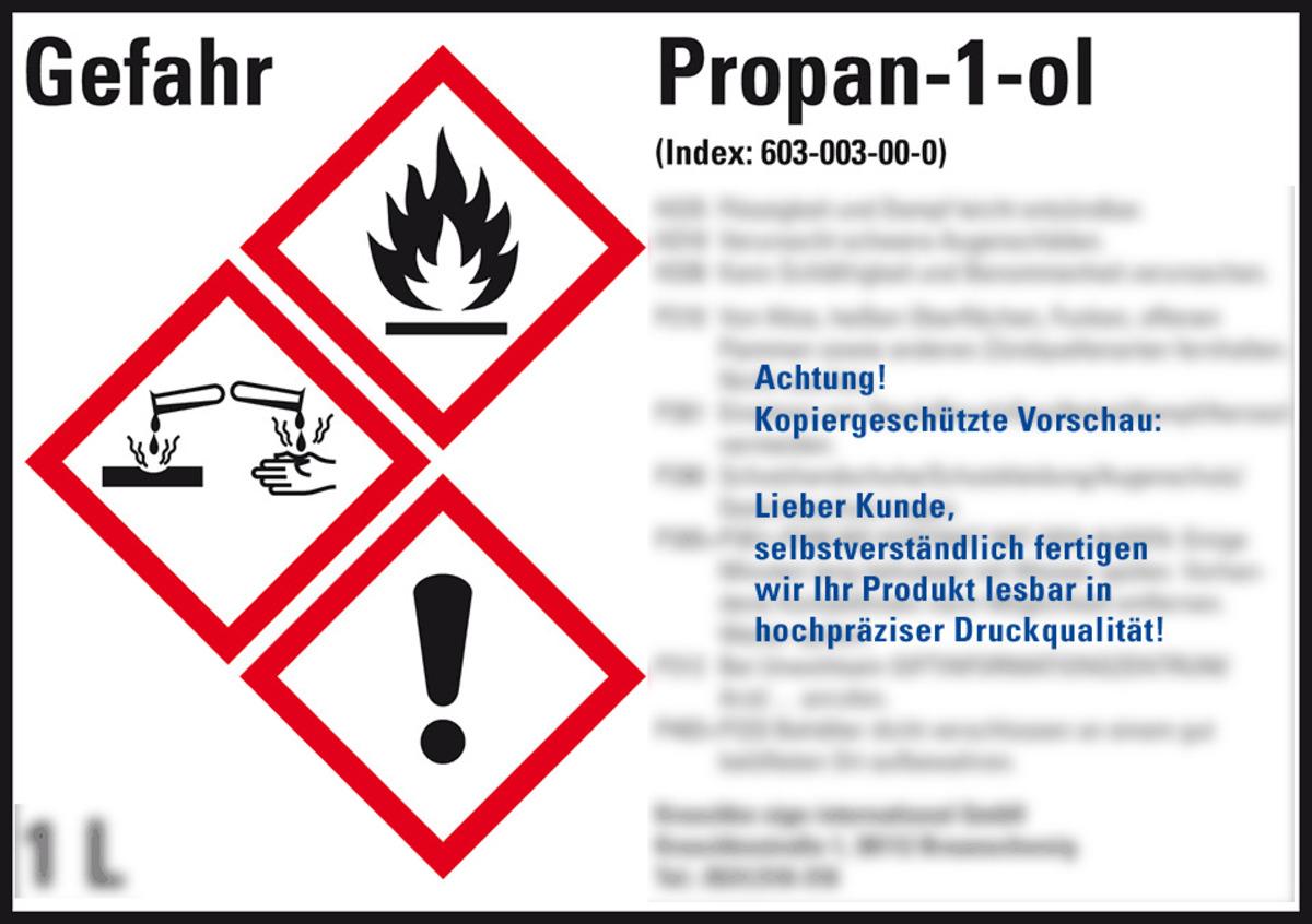Auswahl: Gefahrstoffetikett Propan-1-ol, nach Wunsch, GefStoffV/GHS/CLP, Folie, 105x74mm, 8/Bogen