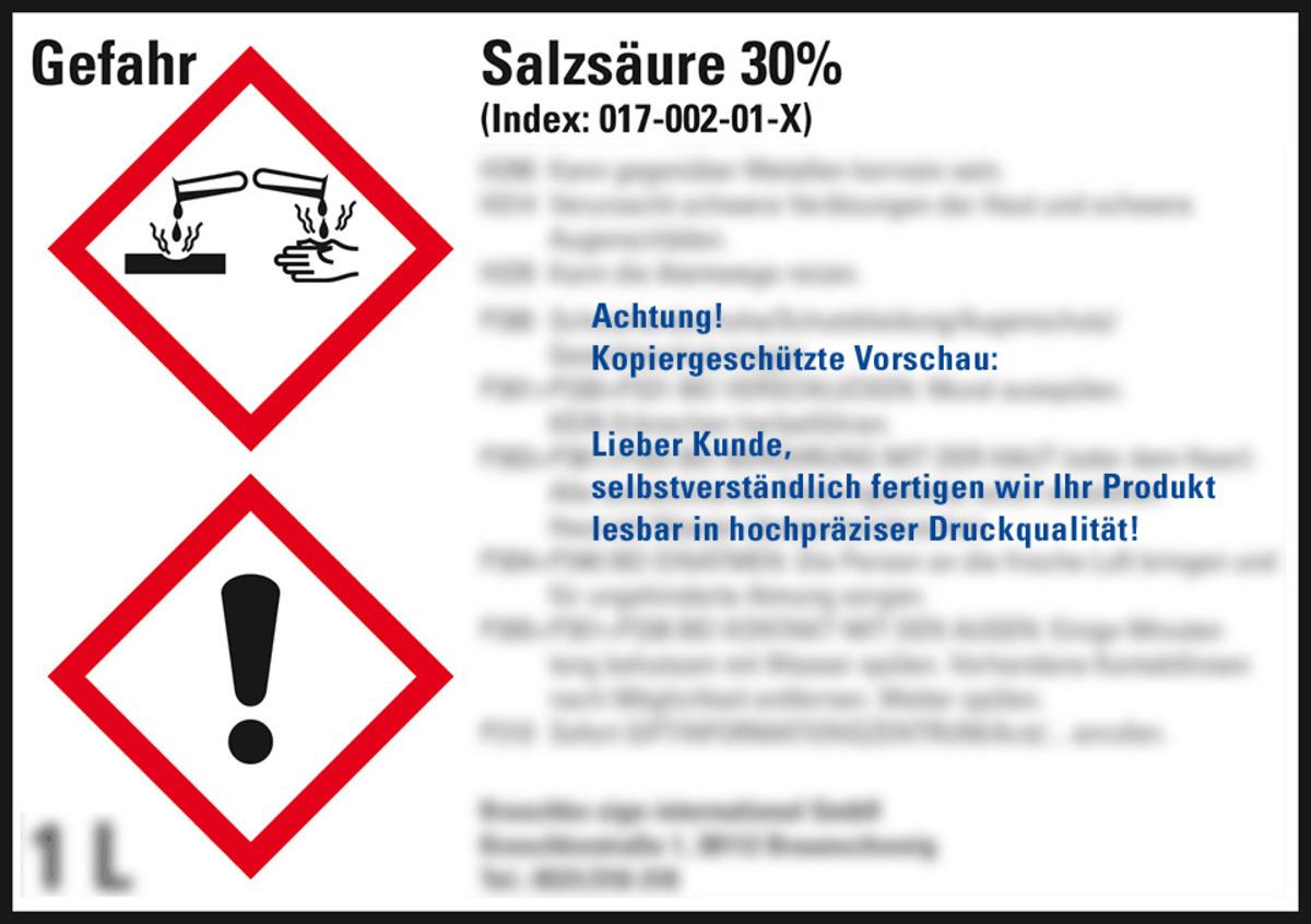 Auswahl: Gefahrstoffetikett Salzsäure 30%, nach Wunsch, GefStoffV/GHS/CLP, Folie, 105x74mm, 8/Bogen