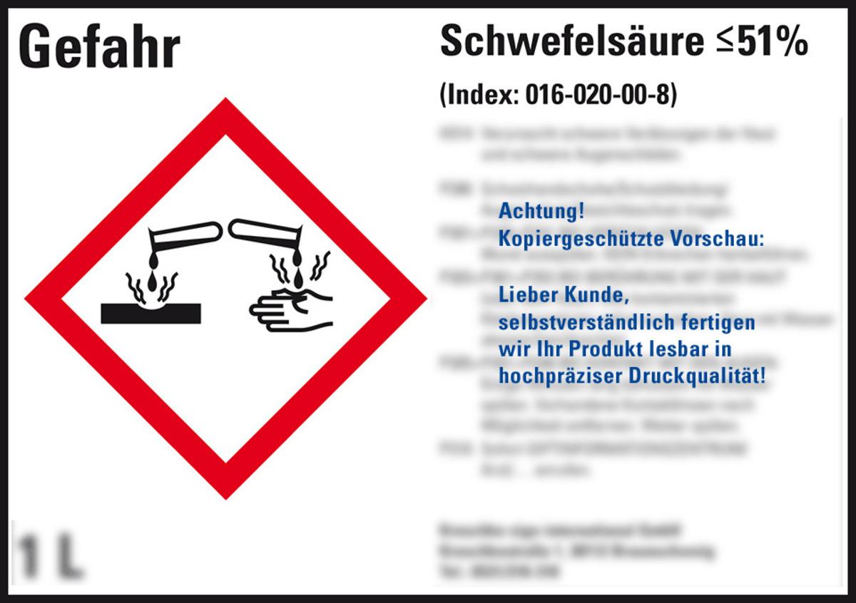 Auswahl: Gefahrstoffetikett Schwefelsäure <=51%, nach Wunsch, GefStoffV/GHS/CLP, 105x74mm, 8/Bogen