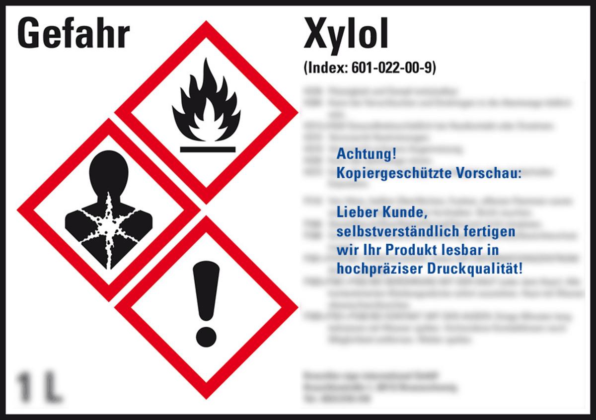 Auswahl: Gefahrstoffetikett Xylol, nach Wunsch, GefStoffV/GHS/CLP, Folie, 105x74mm, 8/Bogen