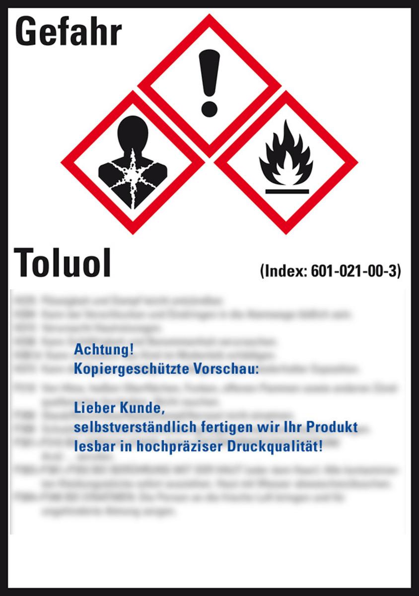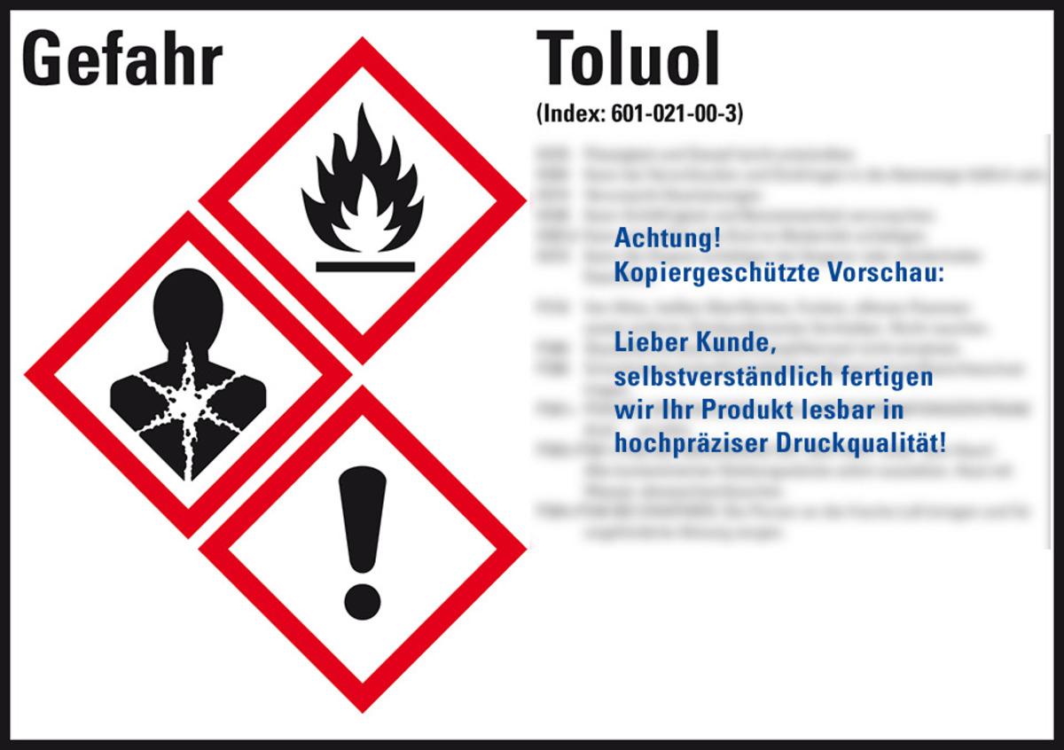 Auswahl: Gefahrstoffetikett Toluol, gem.GefStoffV/GHS/CLP, Folie, 105x74mm, 8/Bogen