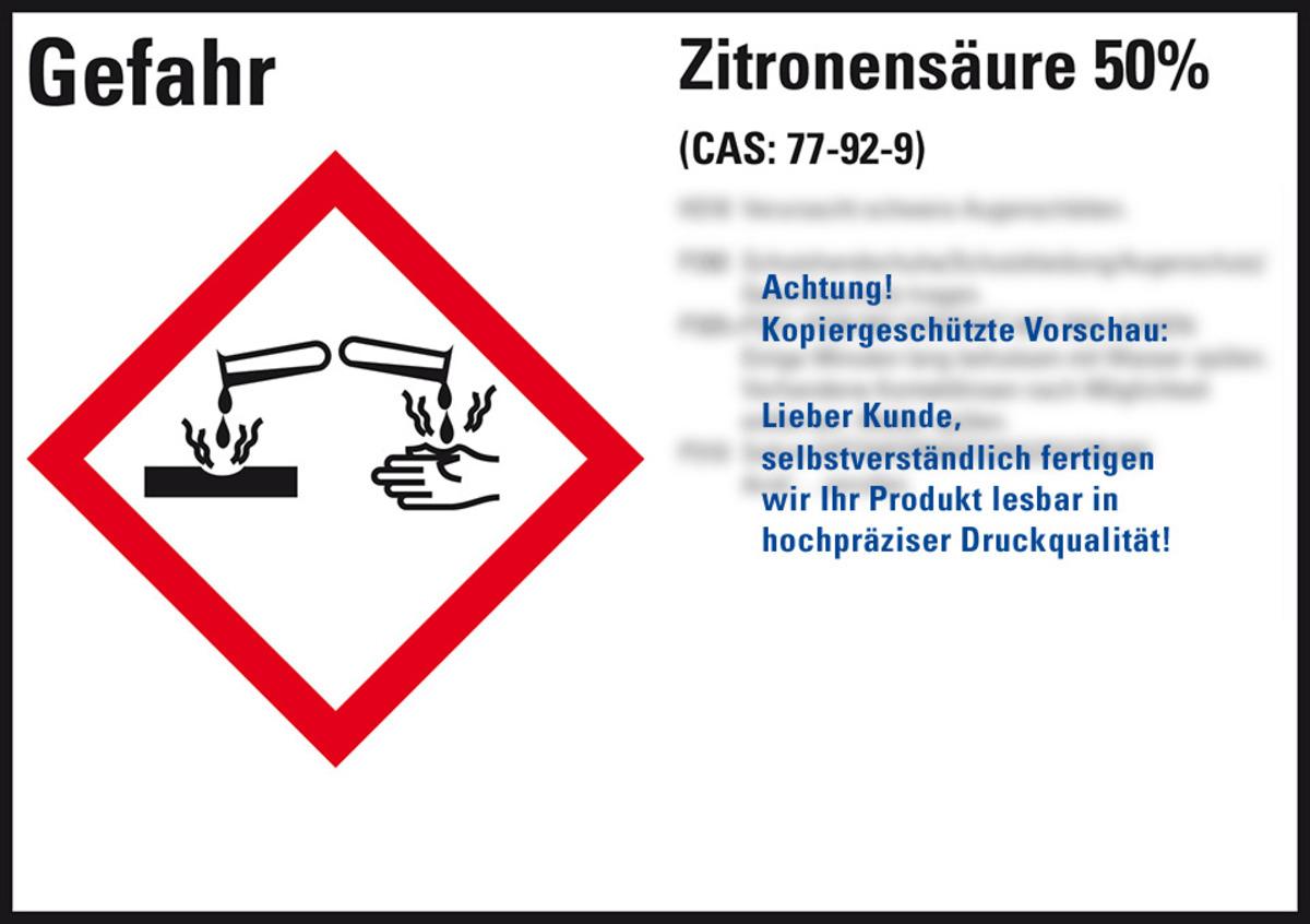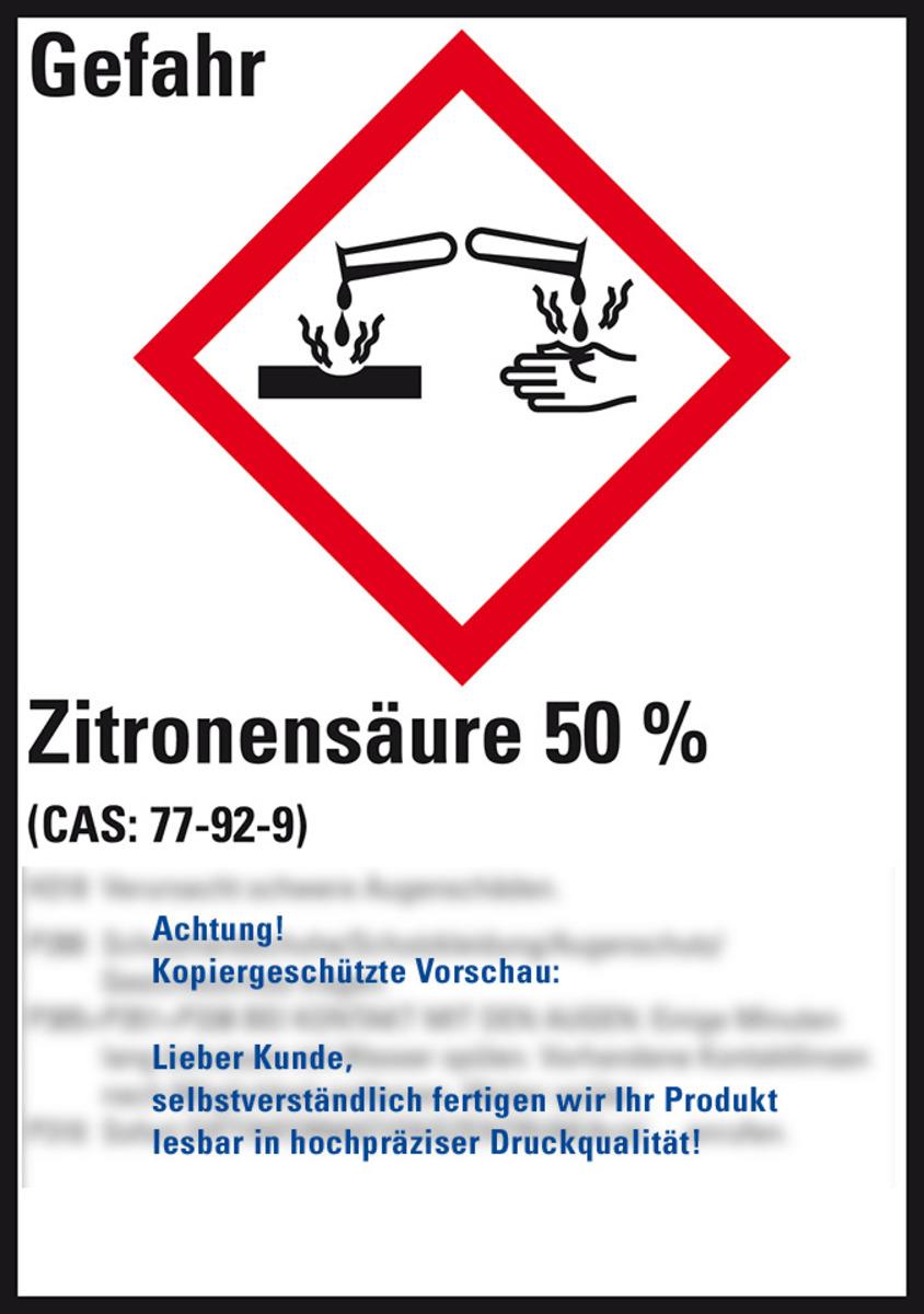 Auswahl: GHS-Etikett Zitronensäure 50%, gem.GefStoffV/GHS/CLP, Folie, 105x74mm, 8/Bogen