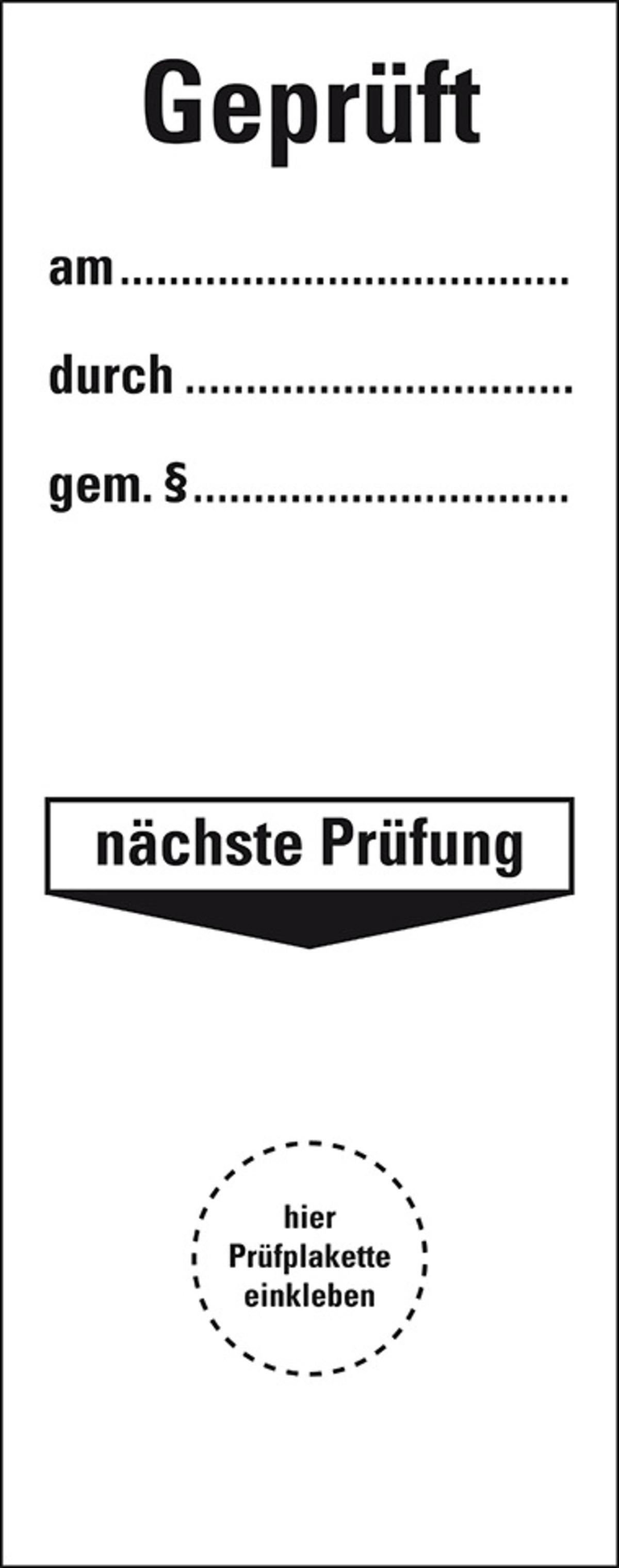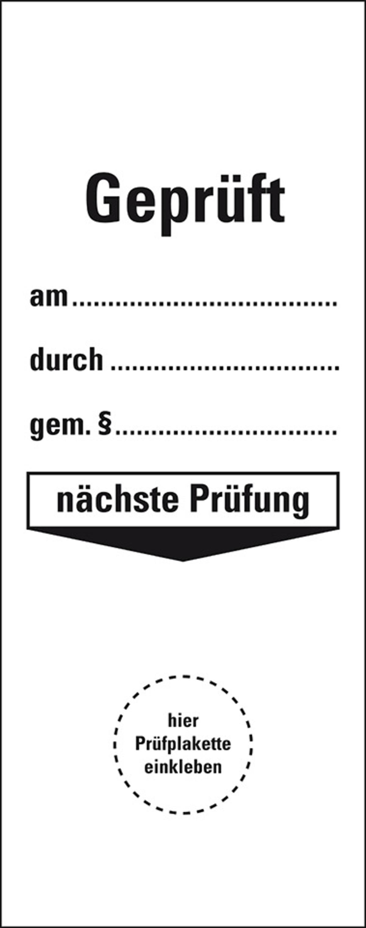 Das Grundetikett "Geprüft gemäß § - nächste Prüfung" ist ideal geeignet für Bereiche, in denen die Kennzeichen häufig gewechselt werden oder in kurzen Abständen geprüft wird.