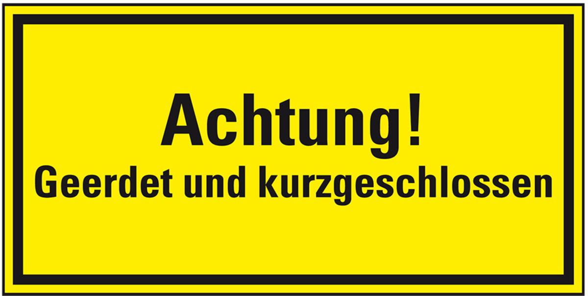 Das Hinweisschild "Achtung! Geerdet und kurzgeschlossen" ist ein Zusatzzeichen, das zusammen mit einem Sicherheitszeichen verwendet werden und zusätzlich Hinweise in Form eines kurzen Textes liefern kann.