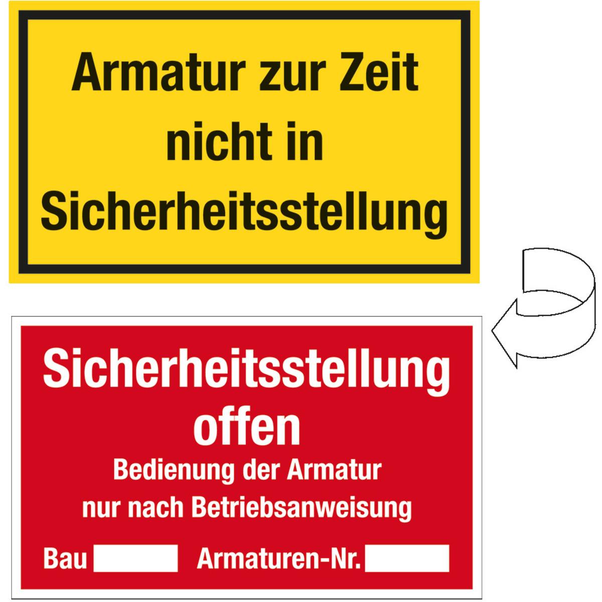 dienen der Arbeitssicherheit und Mitarbeiterinformation, klare Beschriftung für schnelle Erkennbarkeit, deutliche Farbcodierung: Gelb = nicht in Sicherheitsstellung, Rot = Sicherheitsstellung offen, beschriftbare Felder für Bau- und Armaturen-Nr.