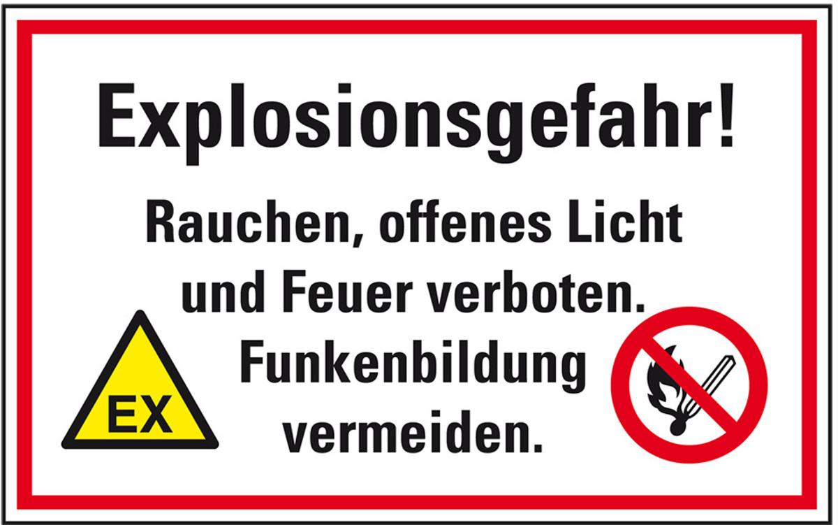 Mit dem Hinweisschild "Explosionsgefahr" weisen Sie in Text und Bild auf die Gefahr und entsprechende Verbote hin. Durch die Kombination aus Piktogramm und Text ist das Schild besonders gut verständlich.