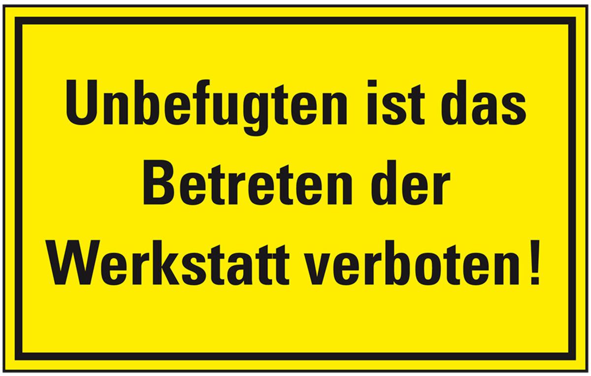 Das Hinweisschild "Unbefugten ist das Betreten der Werkstatt verboten!" vermittelt dem Betrachter Informationen für mehr Sicherheit und ungestörte Arbeitsabläufe.