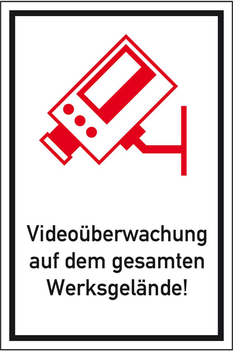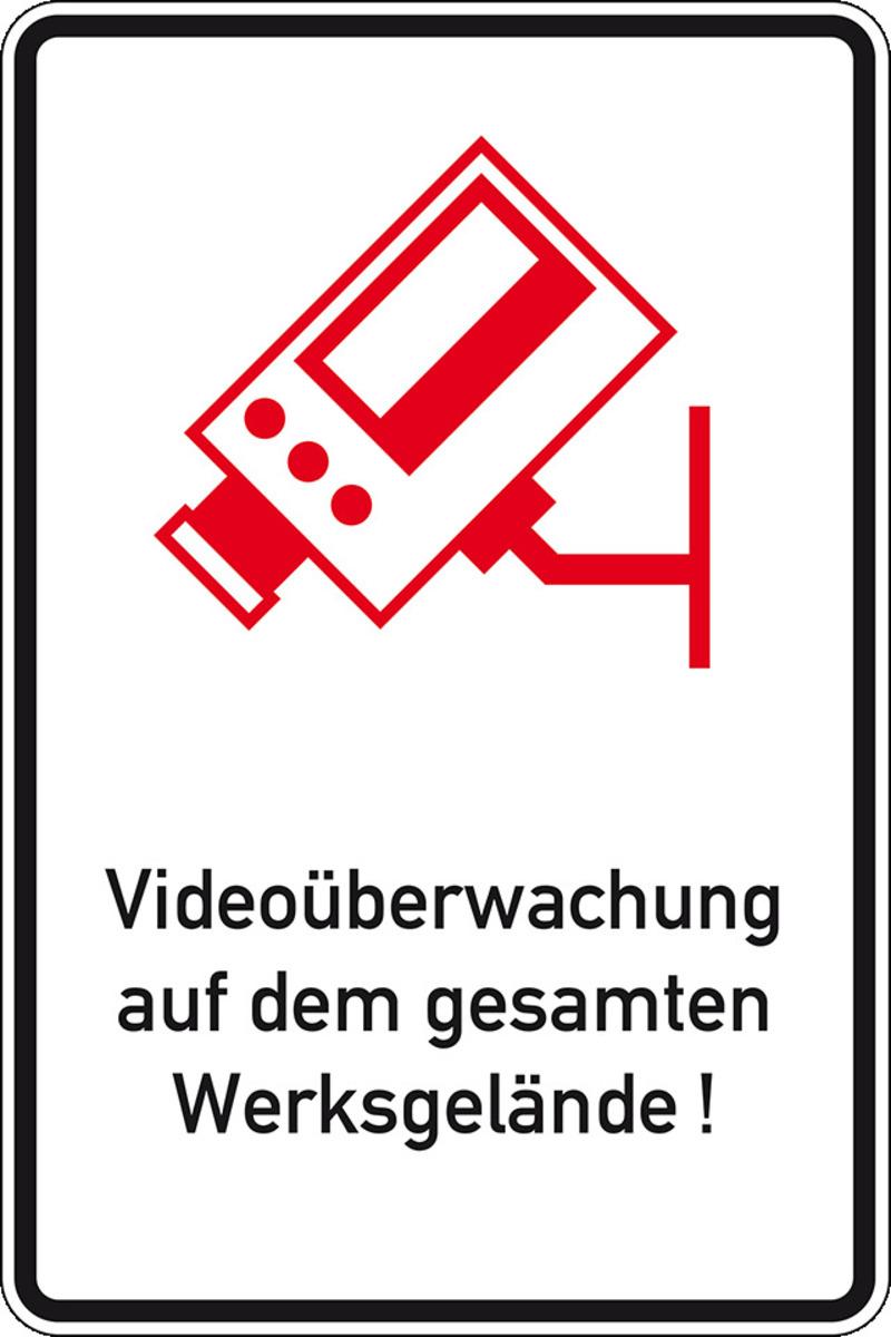 Mit dem Hinweisschild "Videoüberwachung auf dem gesamten Werksgelände" weisen Sie Mitarbeiter und/oder Besucher auf die Videoüberwachung auf dem gesamten Gelände hin.