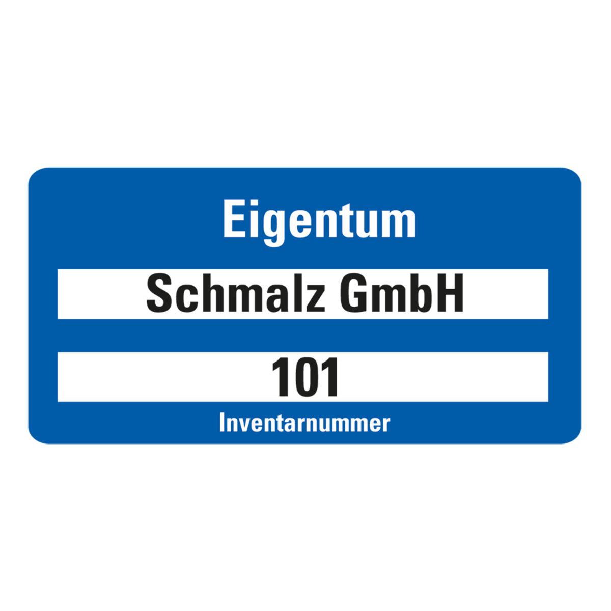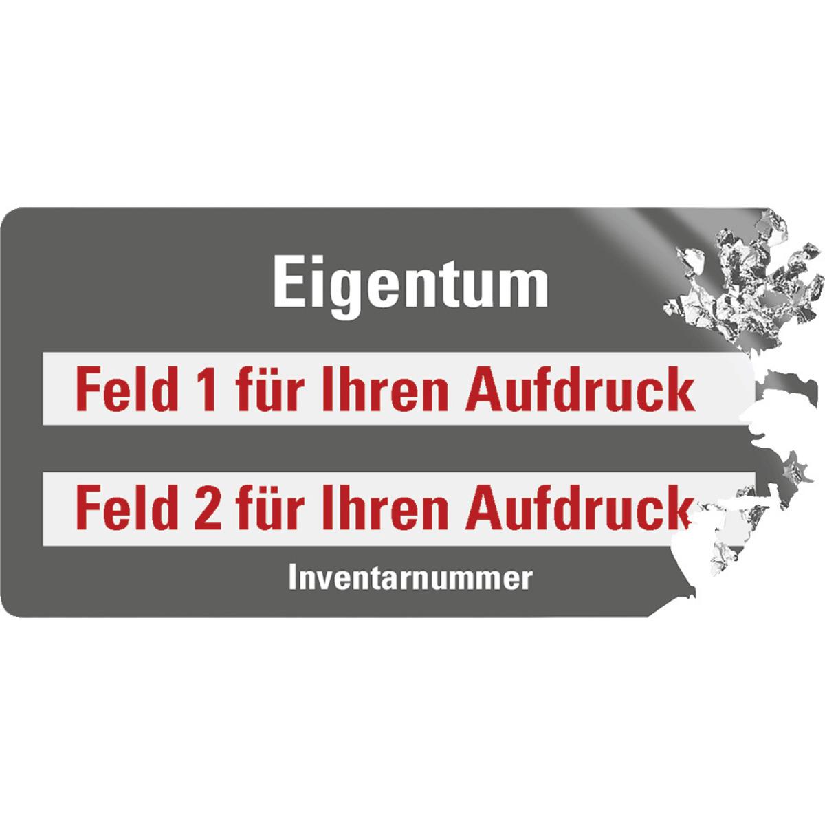 Bedruckbares Inventaretikett, welches "Eigentum" und "Inventarnummer" kennzeichnet und dazu zwei Textfelder nach Wunsch bietet.
