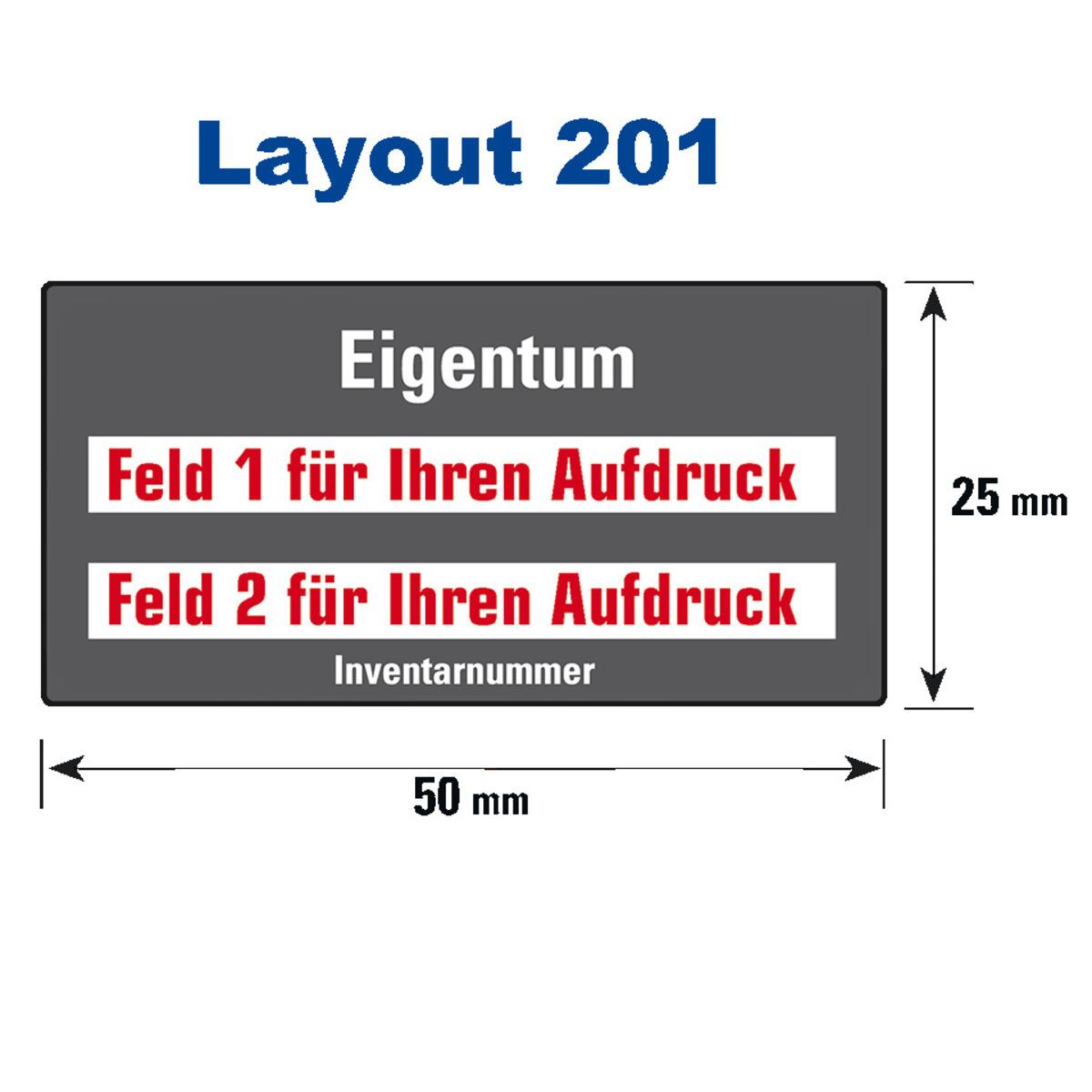 Auswahl: Inventaretikett Eigentum, 2 Felder Text nach Wunsch, Dokumentenfolie, 50x25mm, 9/Bogen