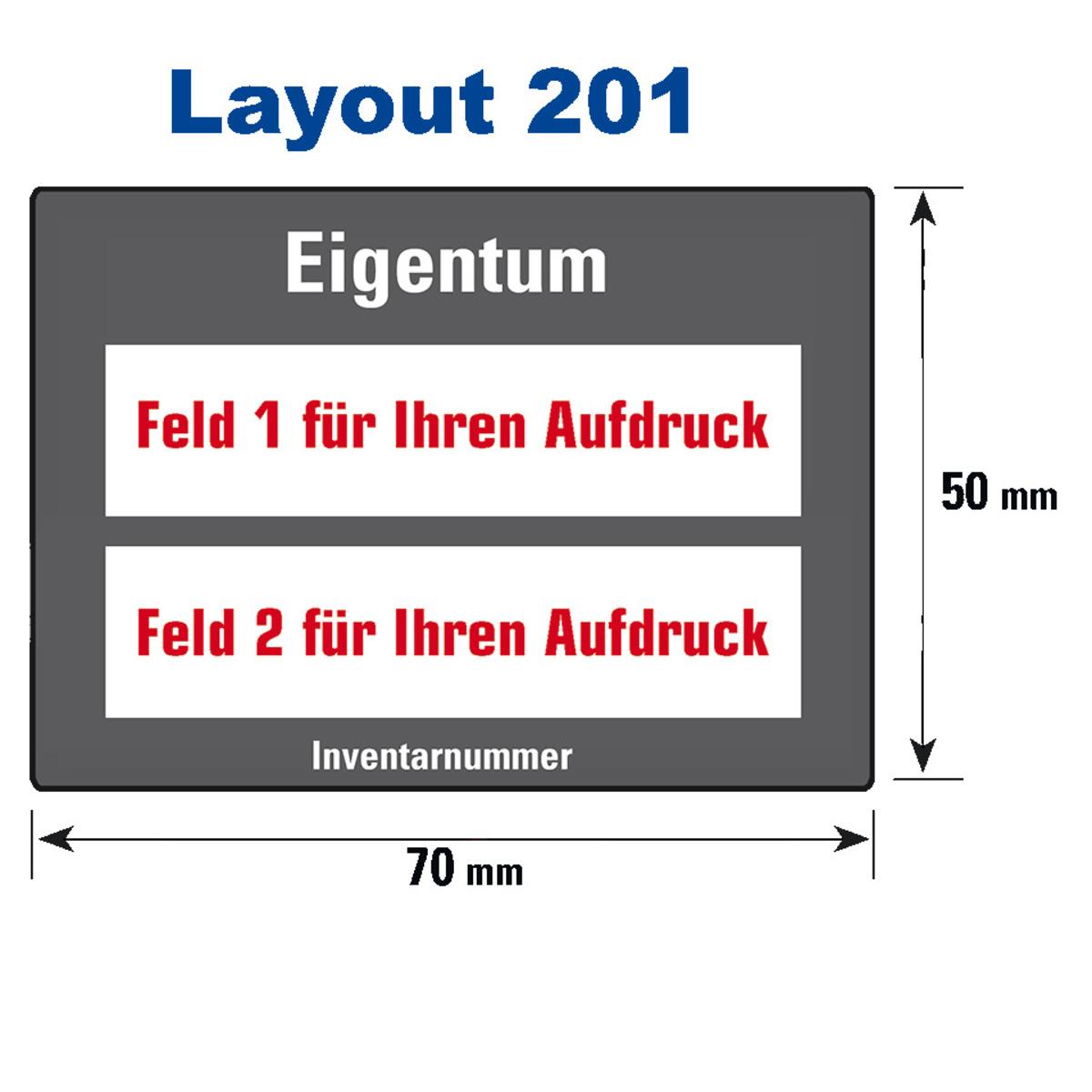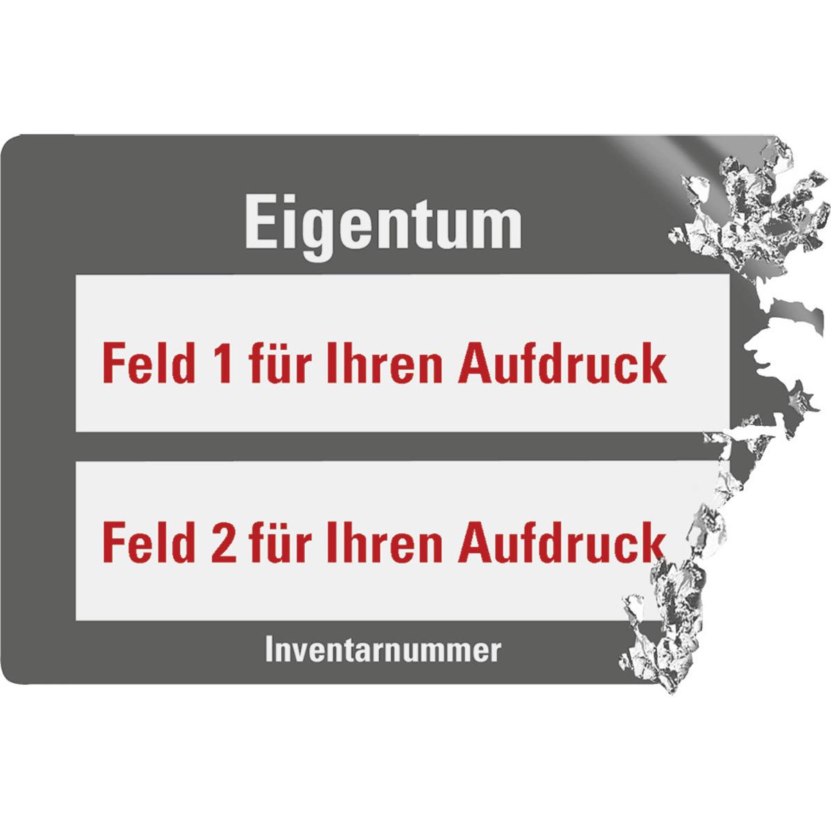 Auswahl: Inventaretikett Eigentum, 2 Felder Text nach Wunsch, Dokumentenfolie, 70x50mm, 3/Bogen