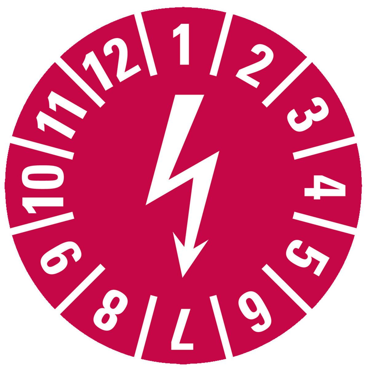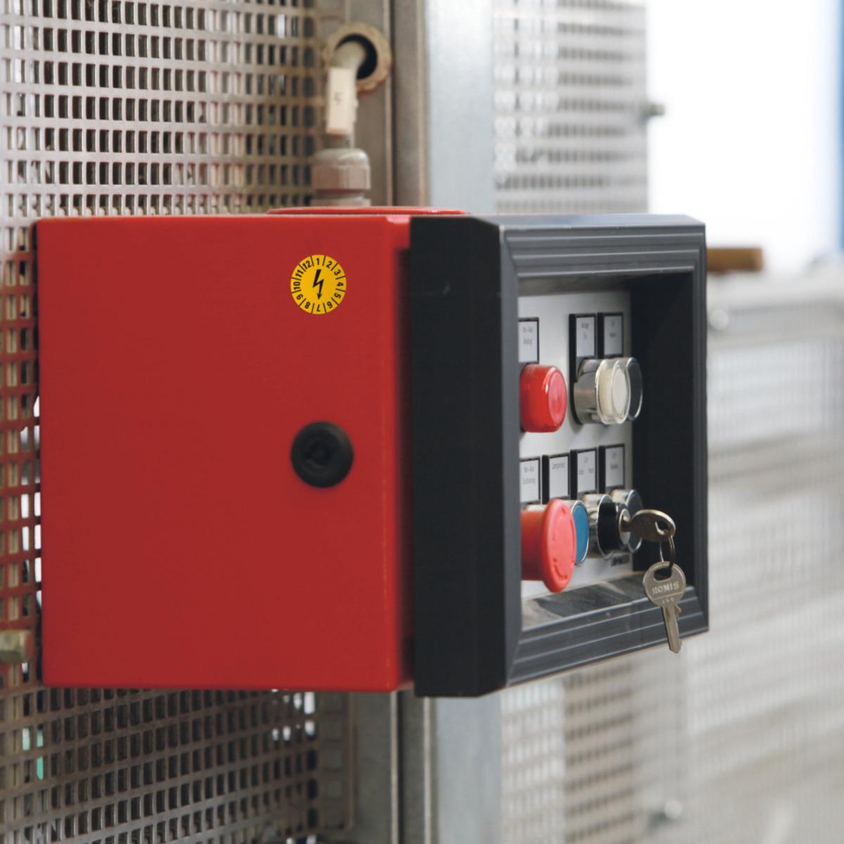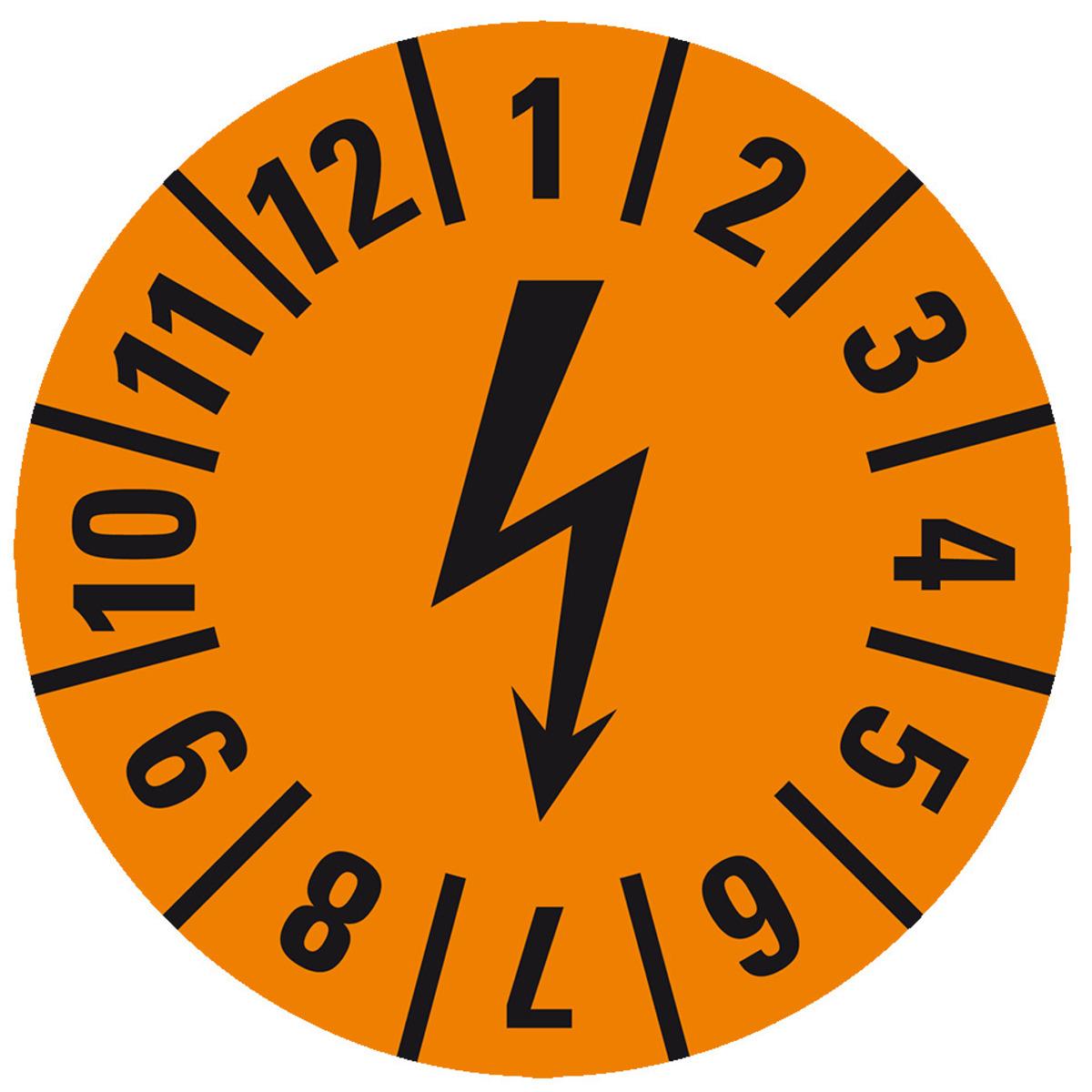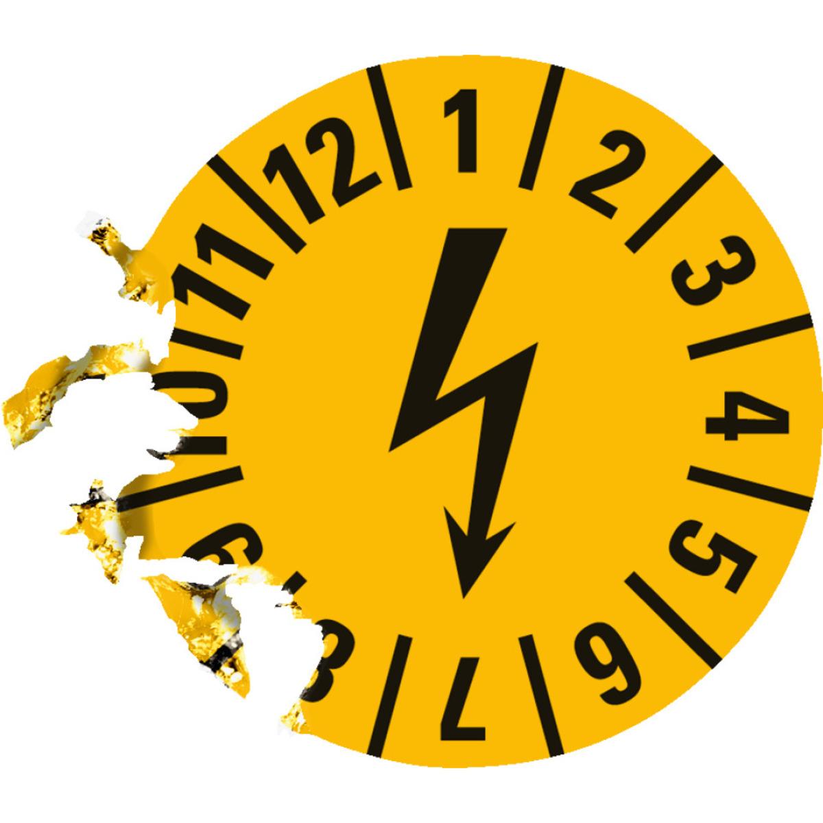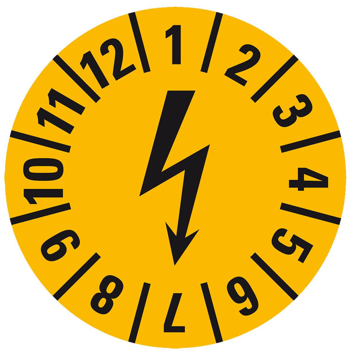 Auswahl: Prüfplakette mit Blitzpfeil, gelb, Dokumentenfolie, selbstklebend, Ø15mm, 60/Bogen