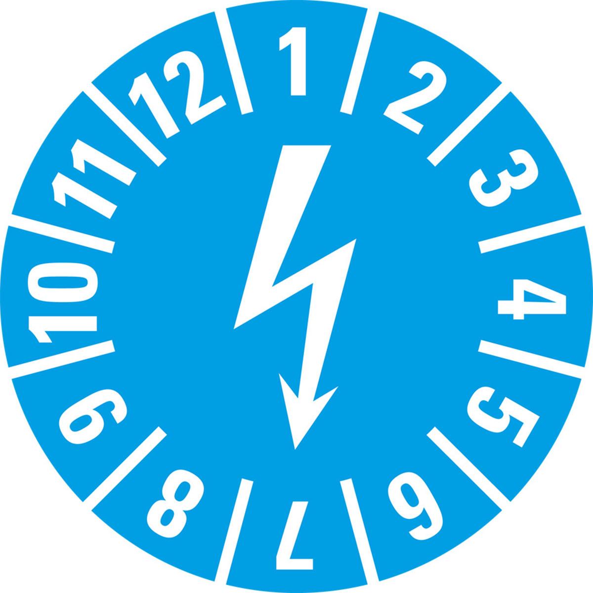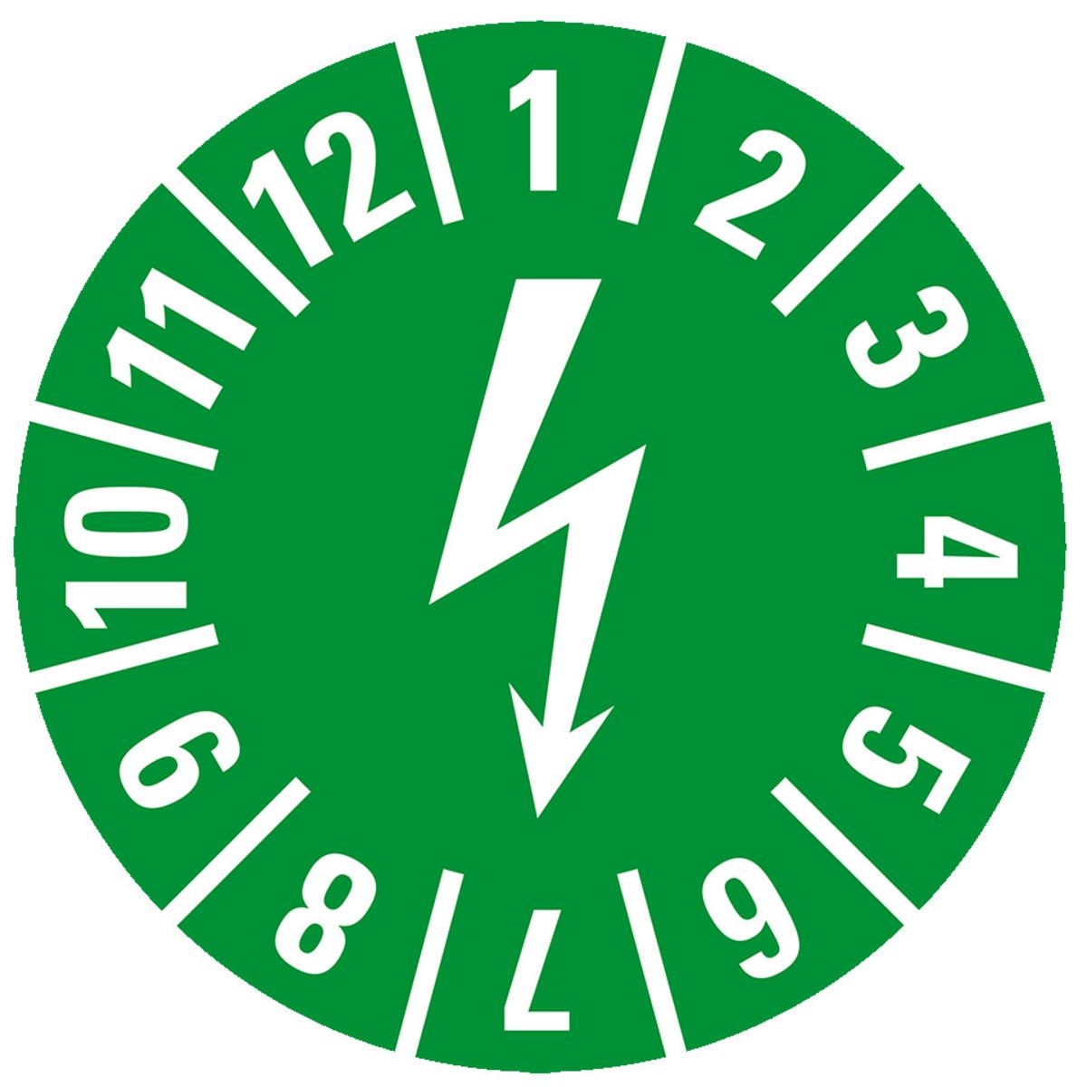 Jahresprüfplakette mit Blitzpfei zur Prüfung elektrischer Arbeitsmittel.