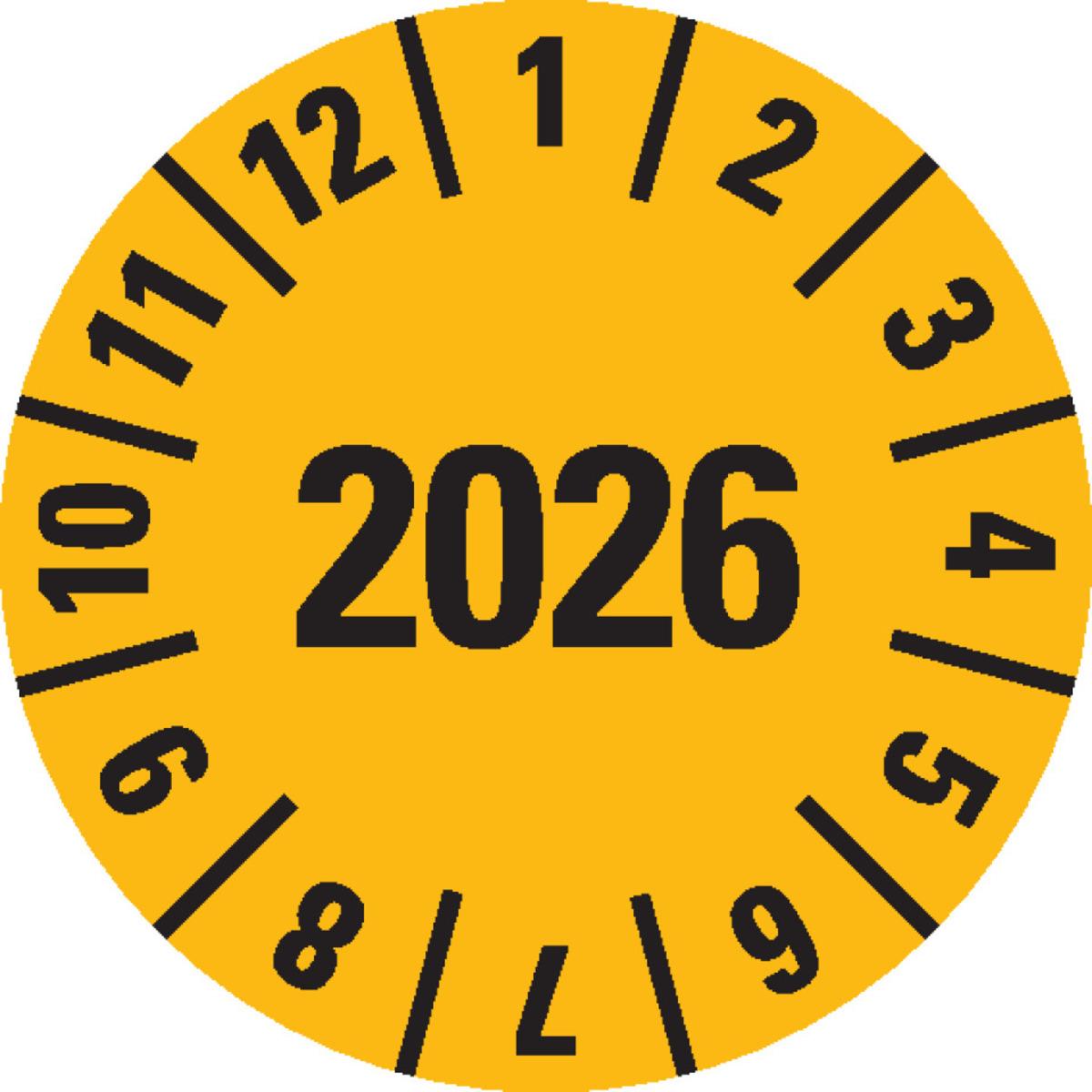 Auswahl: Prüfplakette 2026, gelb, Dokumentenfolie, selbstklebend, Ø 15 mm, 420/Heft