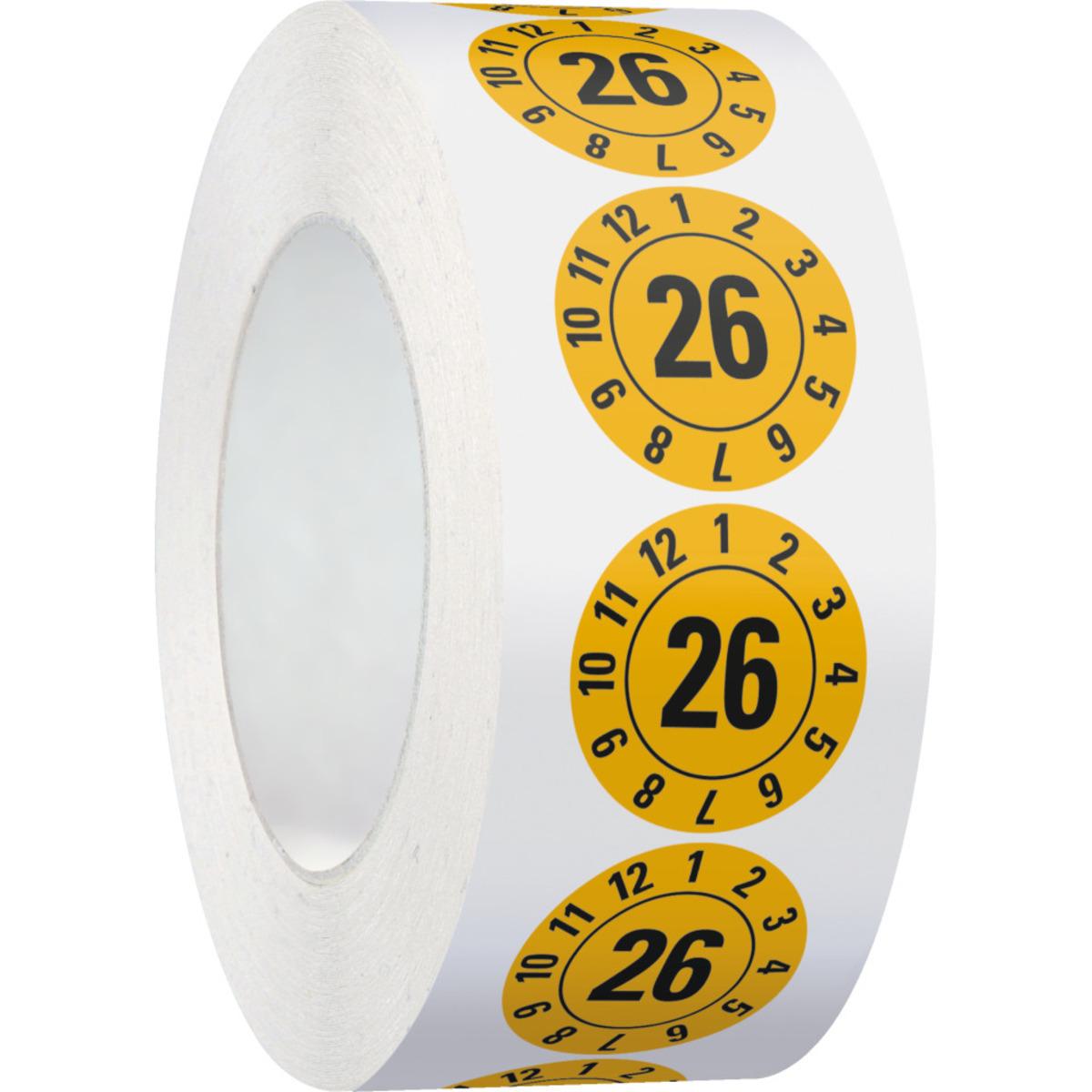 Auswahl: Jahresprüfplakette 26, gelb, Folie, ablösbar, Ø 20mm, 500/Rolle