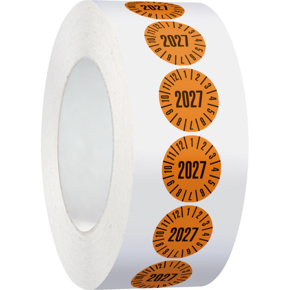 Auswahl: Prüfplakette 2027, orange, Dokumentenfolie, selbstklebend, Ø 20mm, 500/Rolle