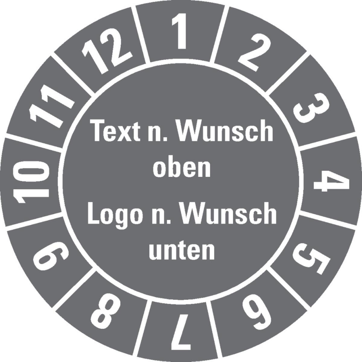 Jahresprüfplakette nach Wunsch, mit Text oben/Logo unten und Monatsring