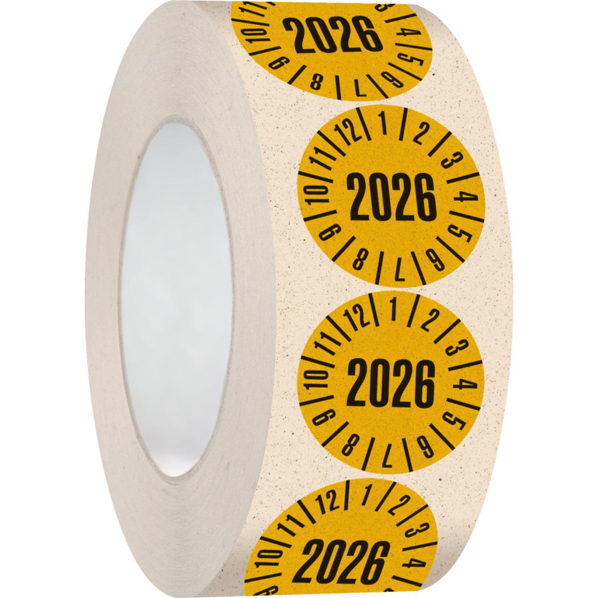 Auswahl: Prüfplakette 2026, gelb, Primärfaser-Graspapier, Ø 30mm, 500/Rolle