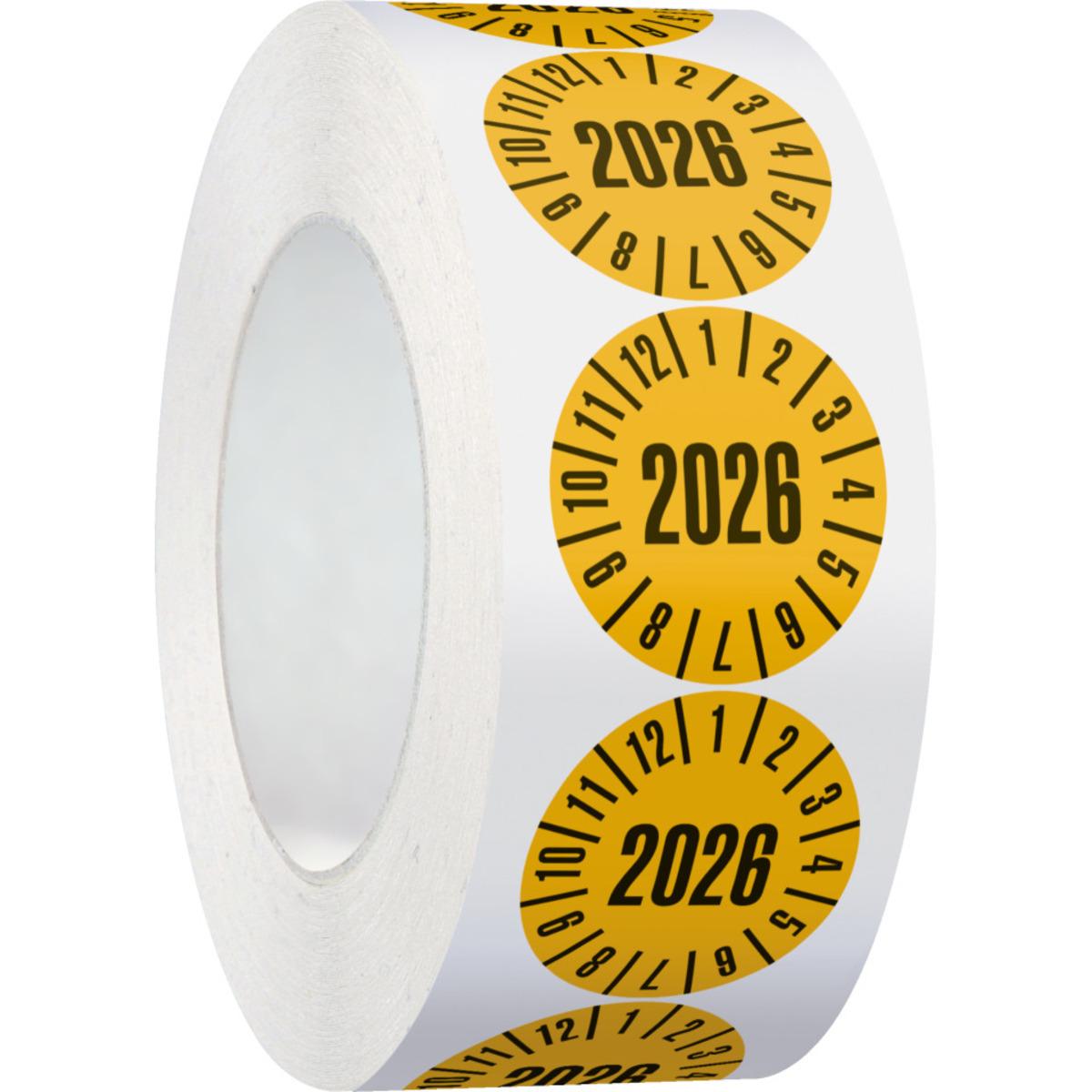 Auswahl: Prüfplakette 2026, gelb, Dokumentenfolie, selbstklebend, Ø 35mm, 500/Rolle
