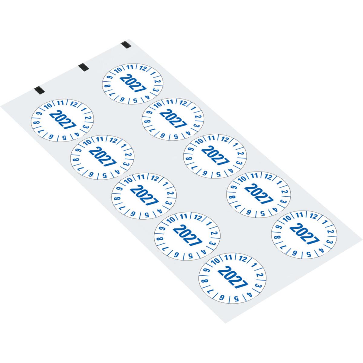 Auswahl: Prüfplakette 2027, weiß, Folie, m.Spezialkl., Oberflächenschutz, Ø 35mm, 10/Bogen