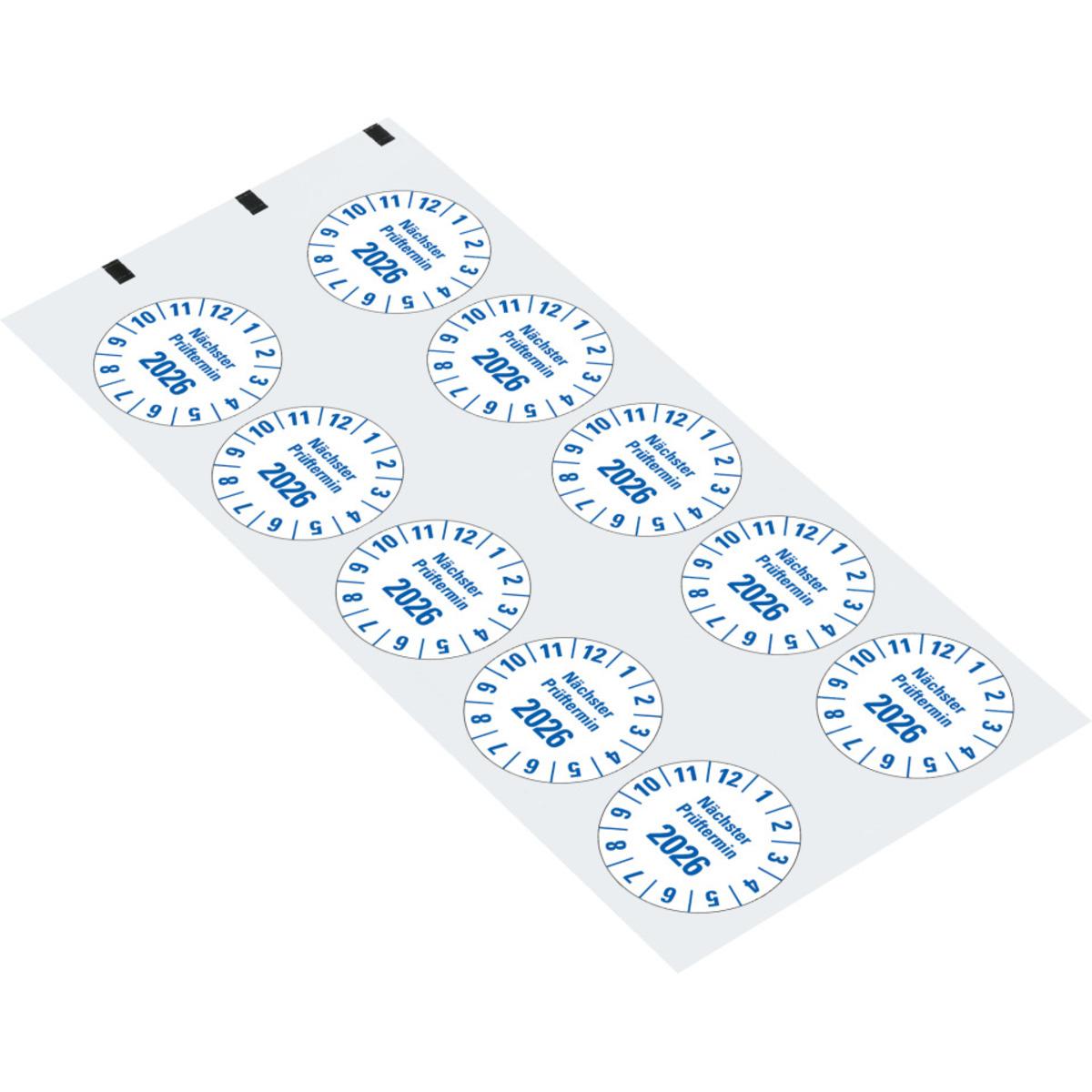 Auswahl: Prüfpl.Nä.Prüftermin 2026, weiß, Folie, mit Spezialkleber, Ø 35mm, 10/Bogen