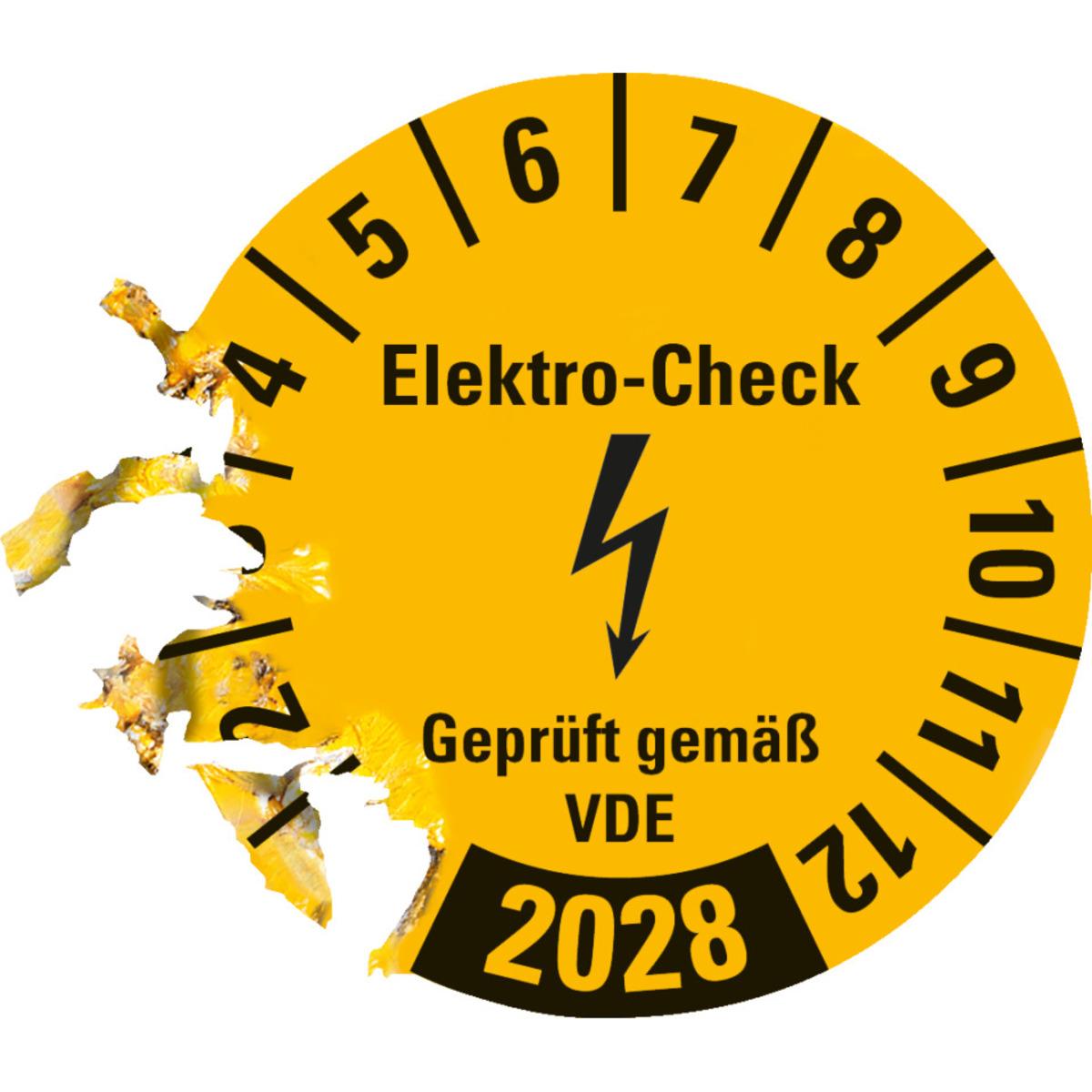 Auswahl: Prüfplakette Elektro-Check Geprüft..., 2028, gelb, Dokumentenfolie, Ø 30mm, 18/Bogen