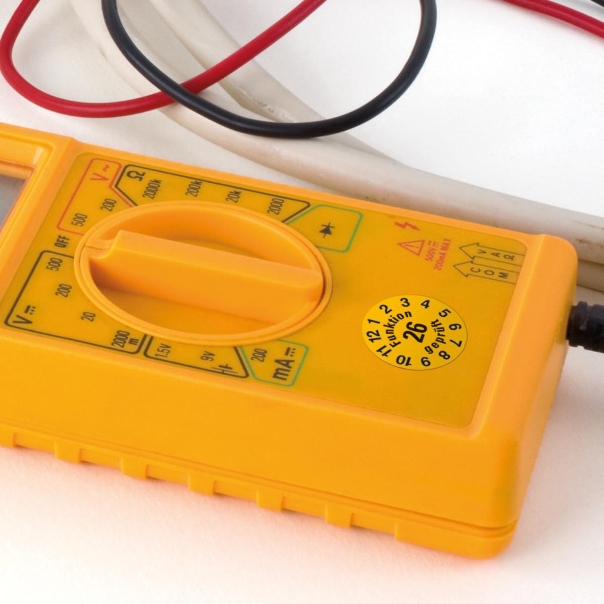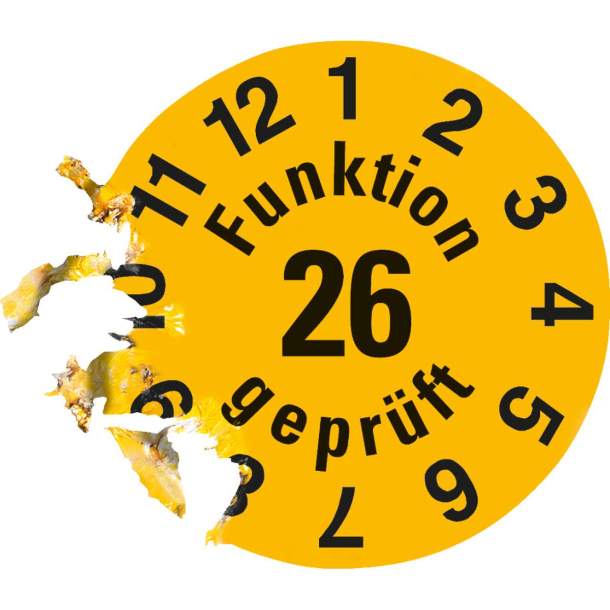 Auswahl: Prüfplakette Funktion gepr.26, gelb, Dokumentenfolie, selbstkl., Ø 15mm, 60/Bogen