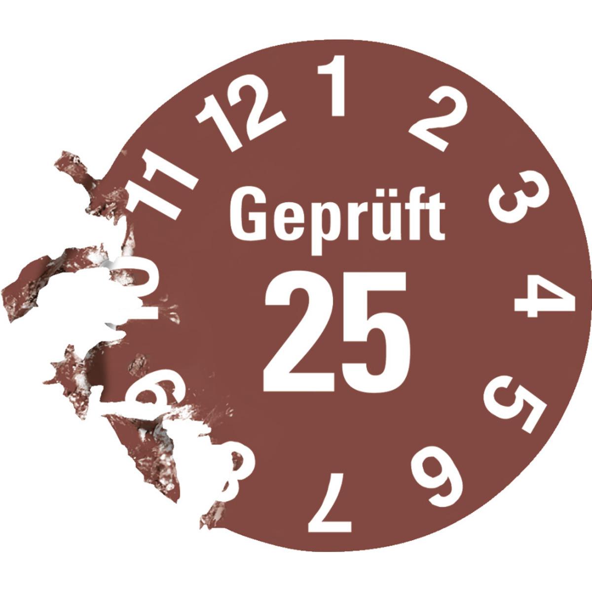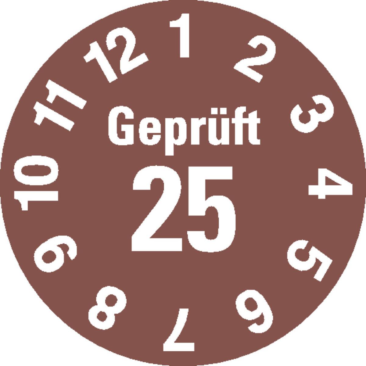 Auswahl: Prüfplakette Geprüft 25, braun, Dokumentenfolie, selbstklebend, Ø 15mm, 60/Bogen