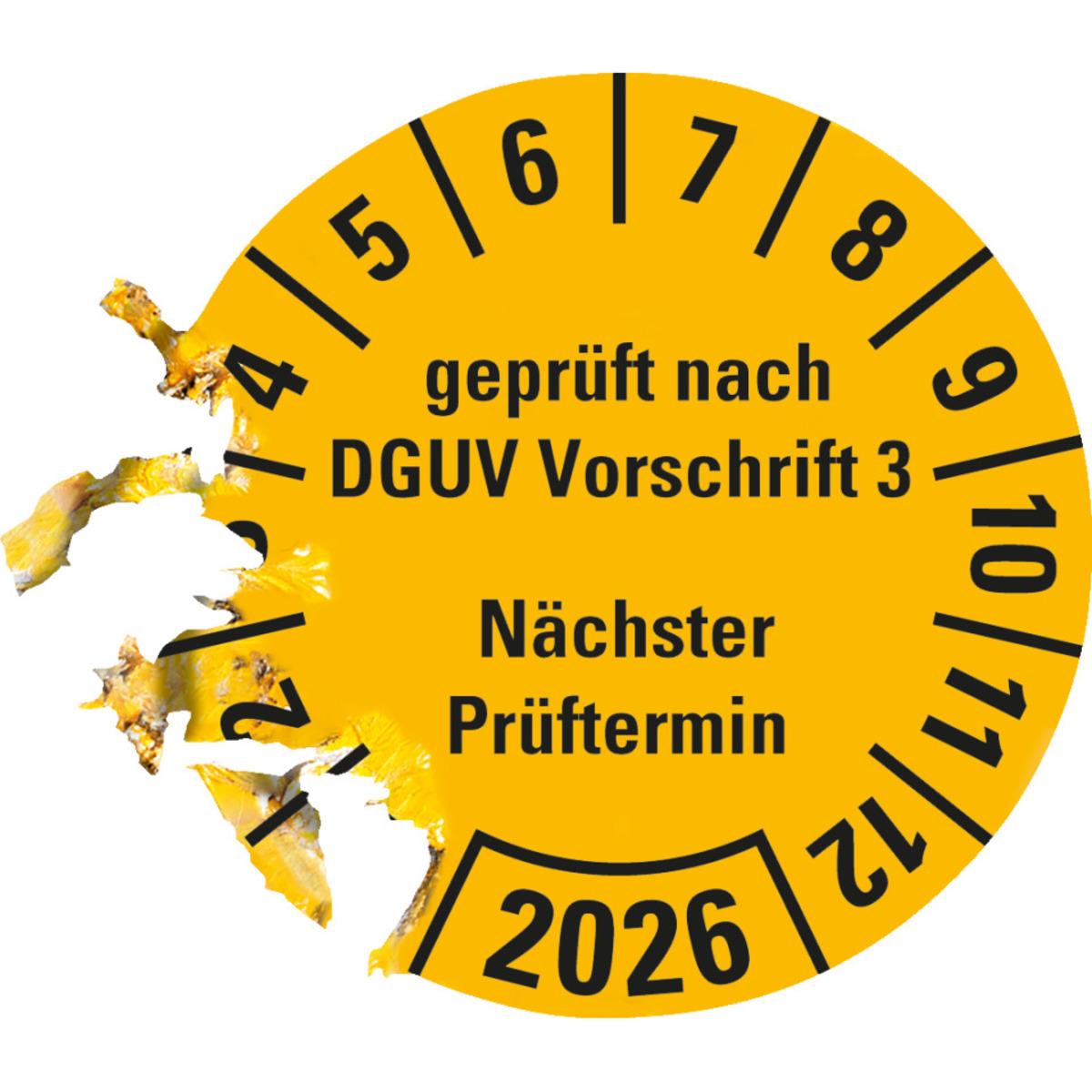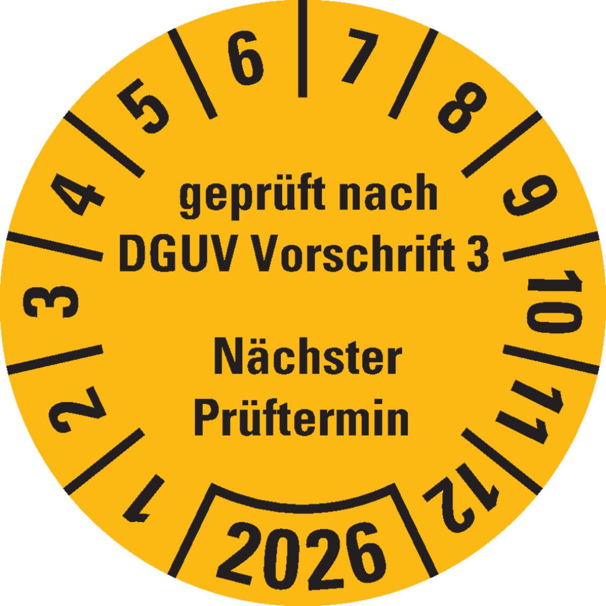 Auswahl: Prüfplakette gepr.n.DGUV Vorschr.3 NP 2026, gelb, Dokufolie, Ø25mm, 500/Rolle