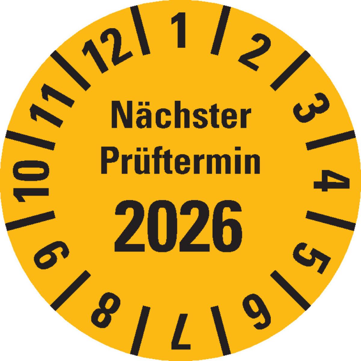 Auswahl: Prüfplakette Nächster Prüftermin 2026, gelb, Polyesterfolie, Spez., Ø 20mm, 36/Bogen