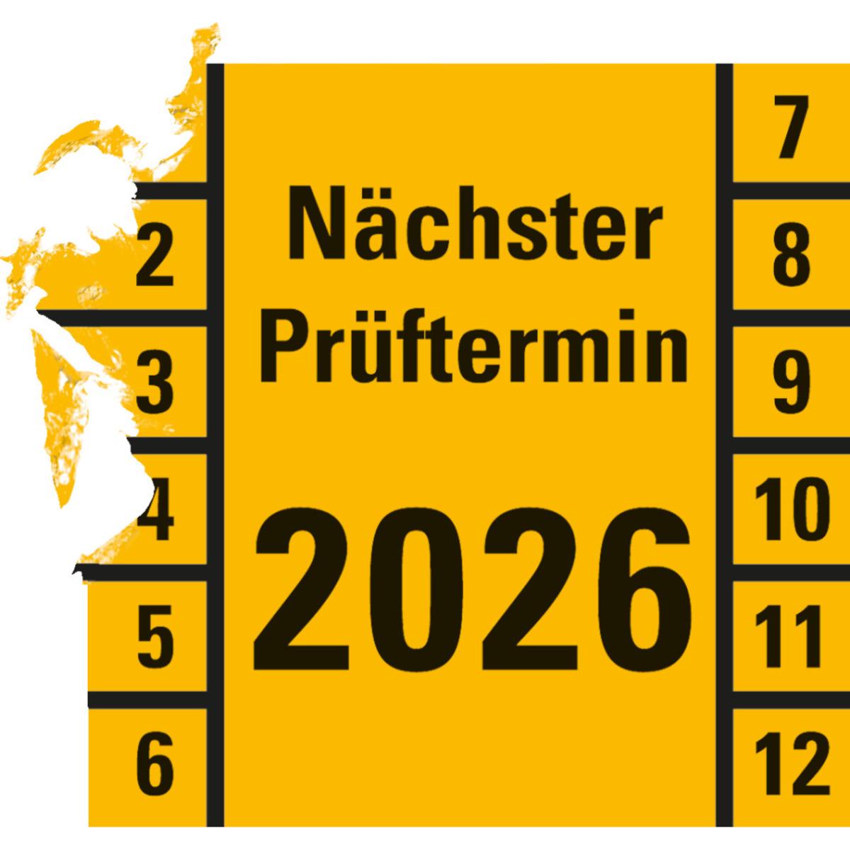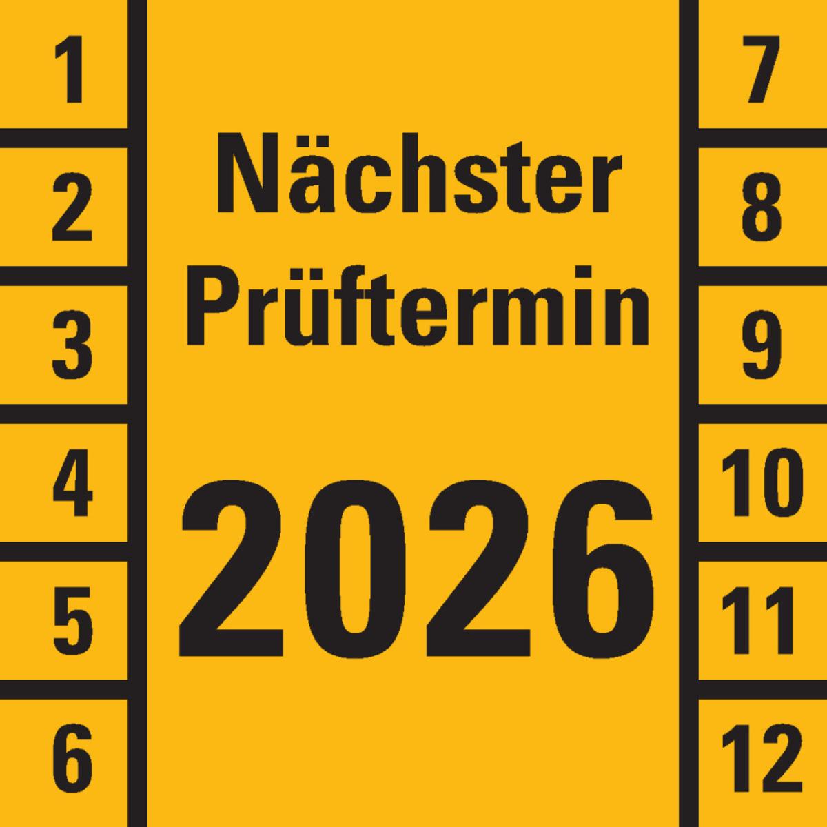 Auswahl: Prüfplakette Nächster Prüftermin 2026, gelb, Dokumentenfolie, 30x30mm, 18/Bogen