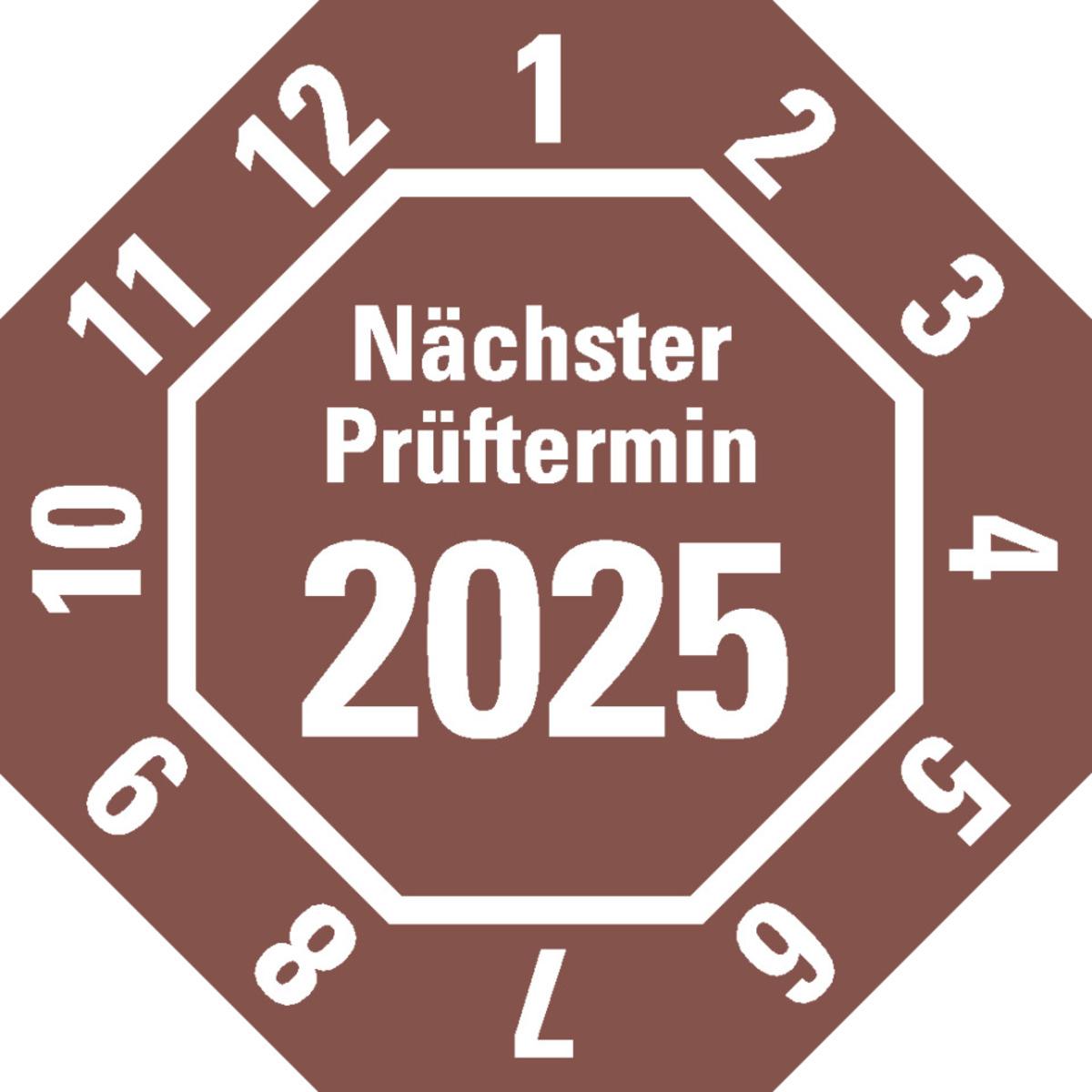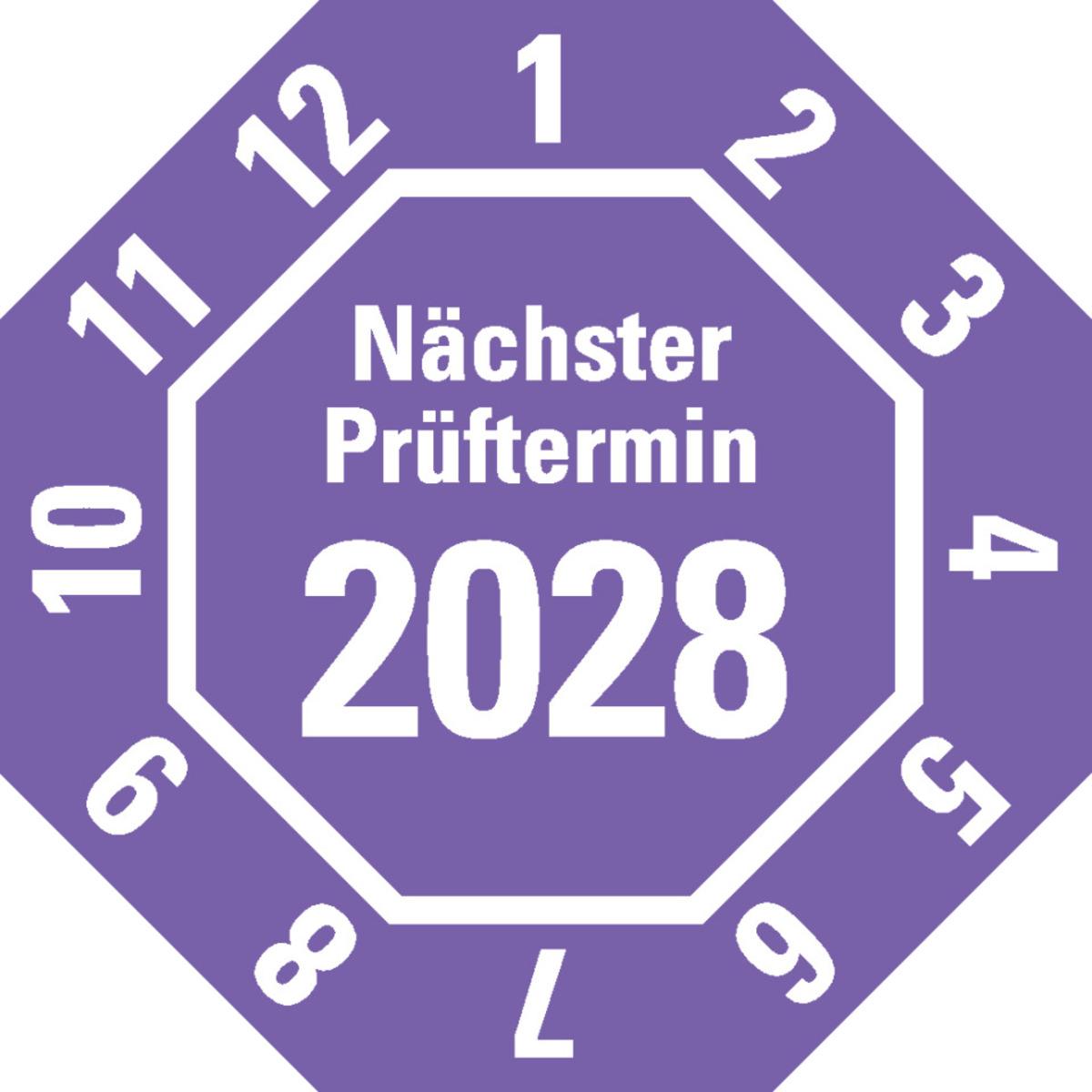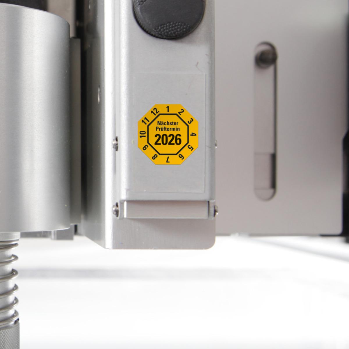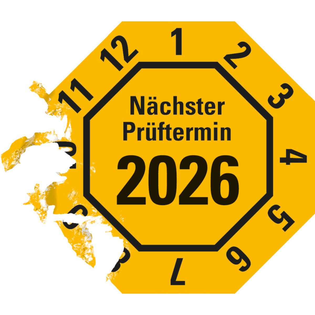 Auswahl: Prüfplakette Nä.Prüftermin 2026, 8-eckig, gelb, Dokufolie, 30x30mm, 18/Bogen