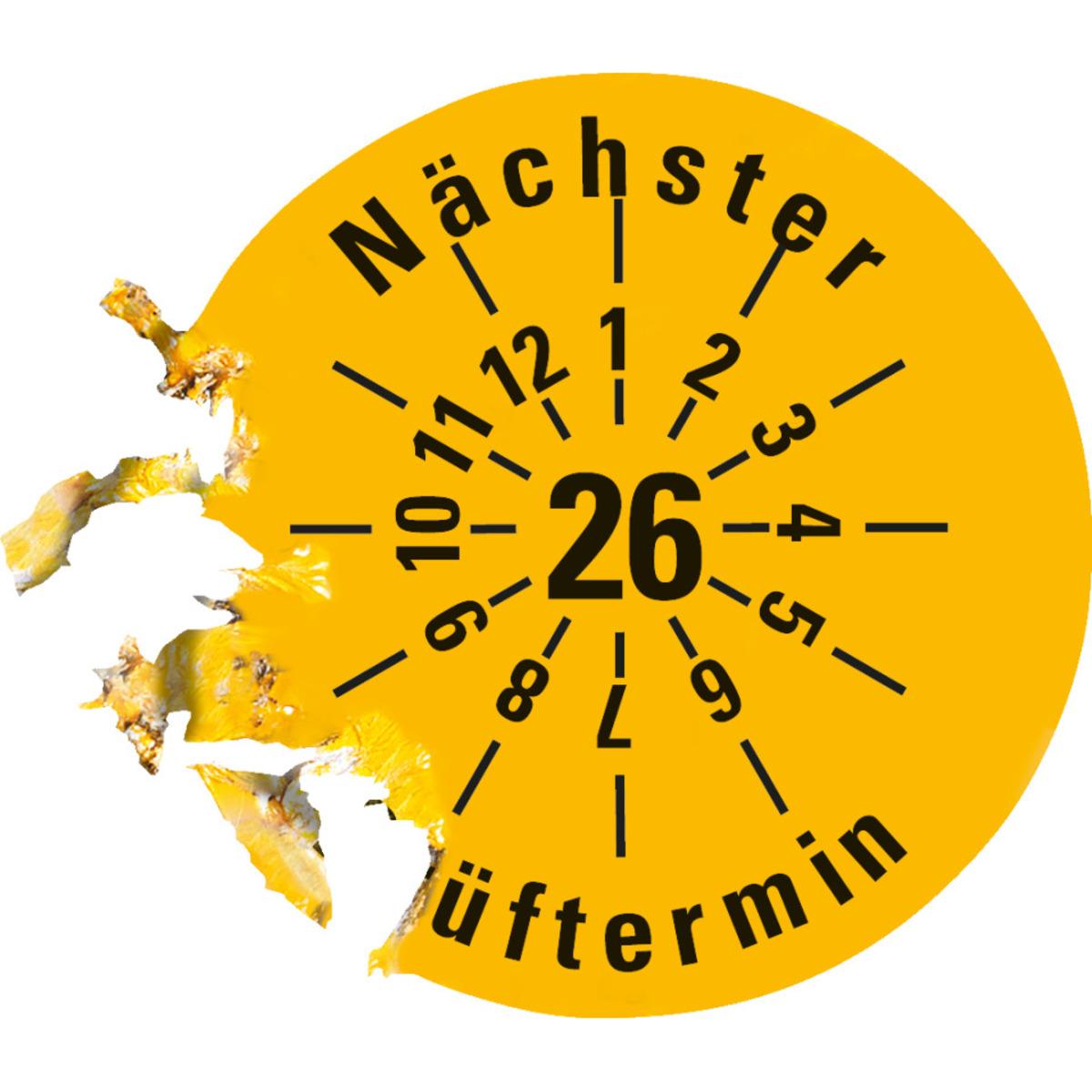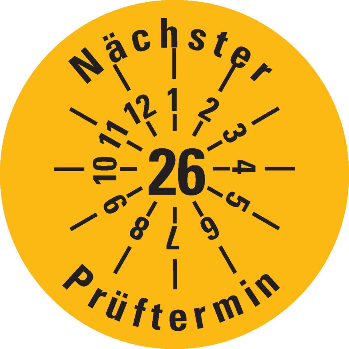 Auswahl: Prüfplakette Nächster Prüftermin 26, gelb, Dokumentenfolie, Ø 30mm, 18/Bogen