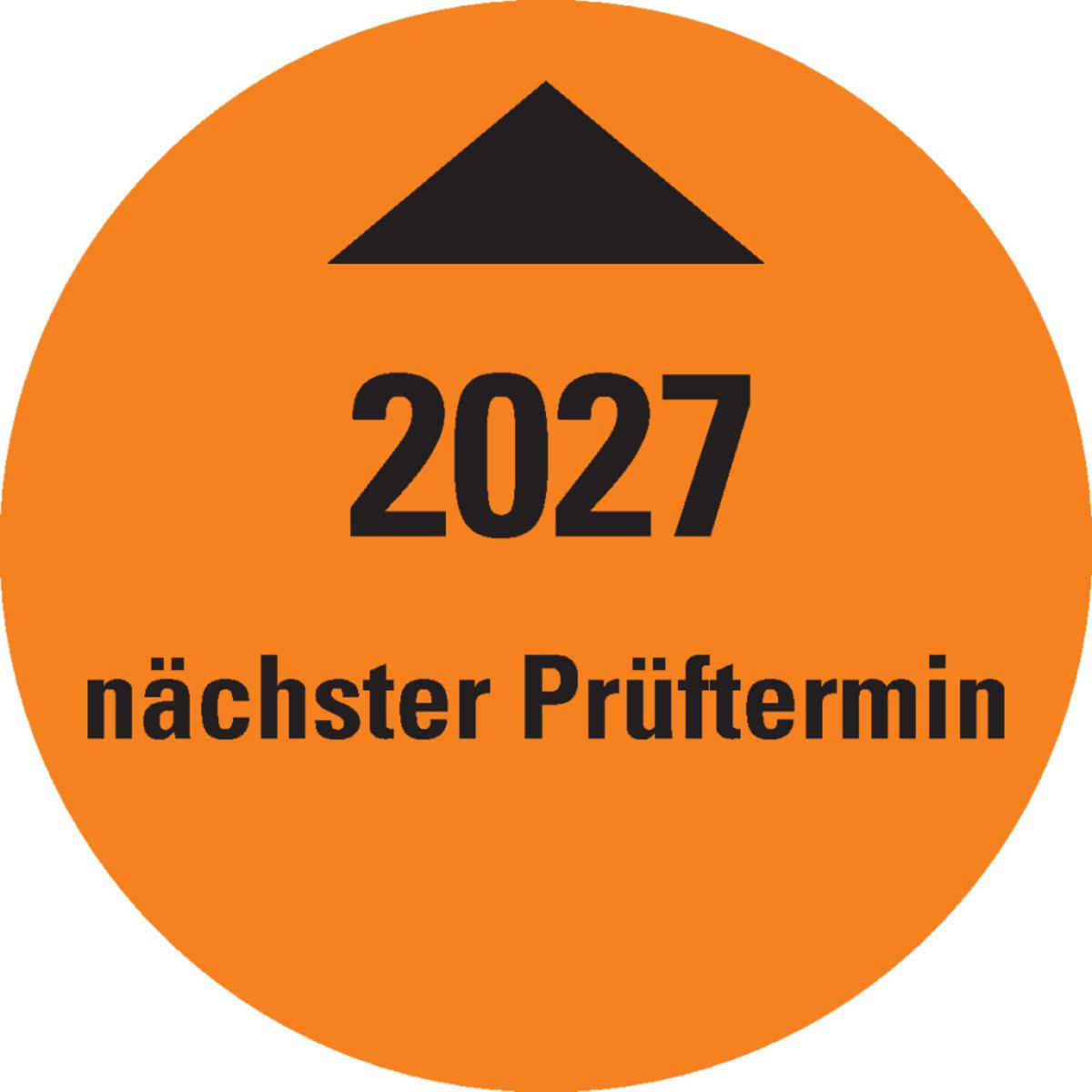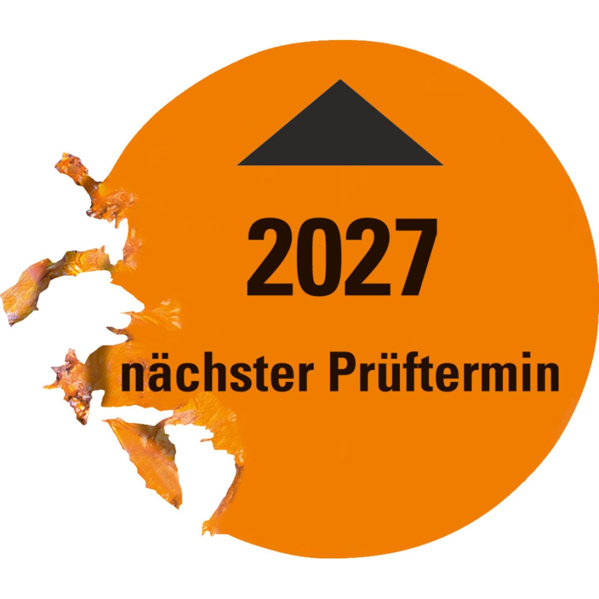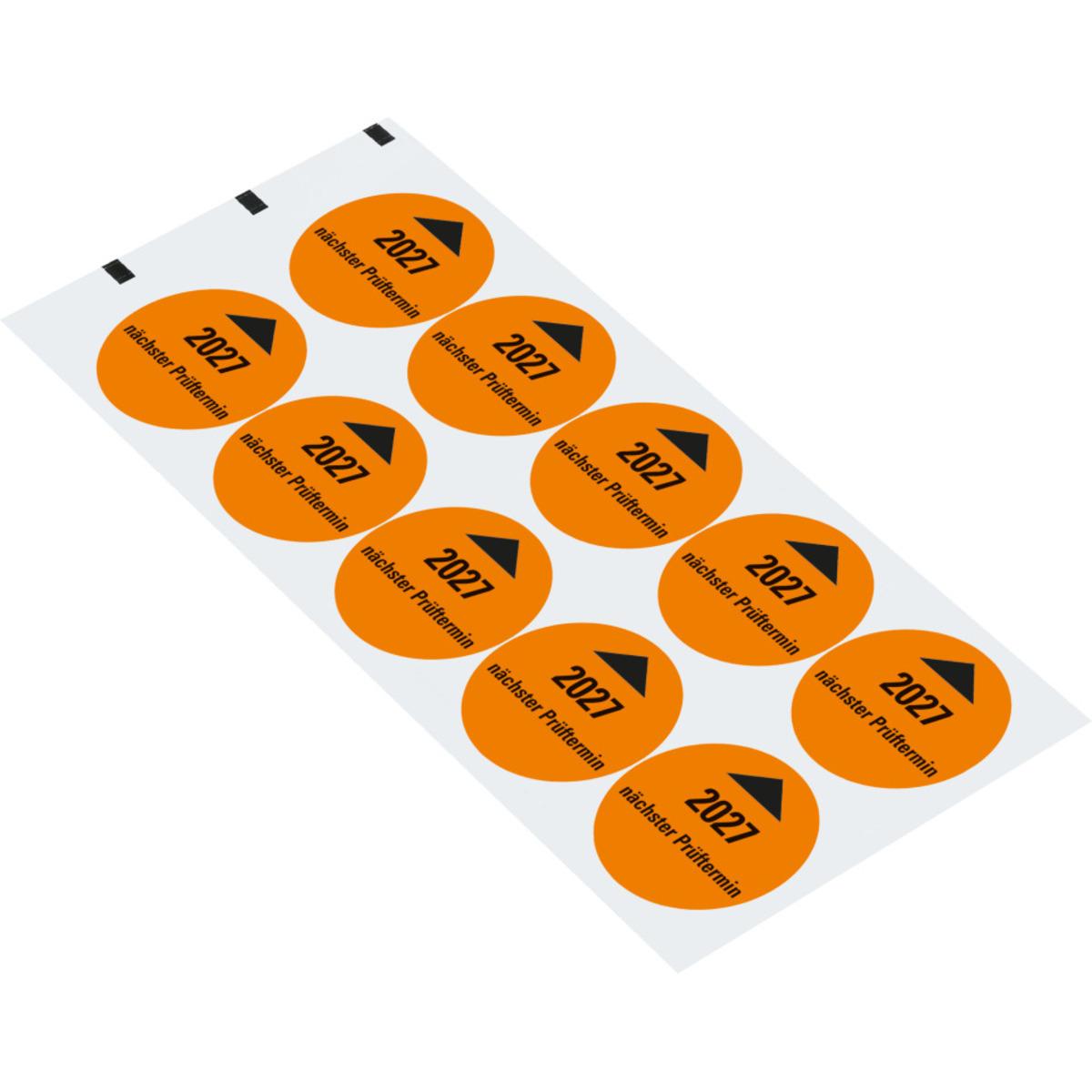 Auswahl: Systemprüfplakette nächster Prüftermin 2027, orange Dokufolie, Ø 30mm, 10/Bogen
