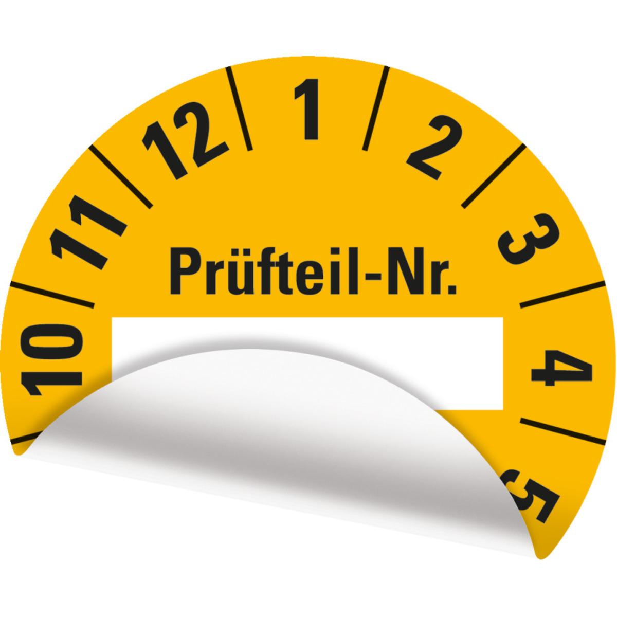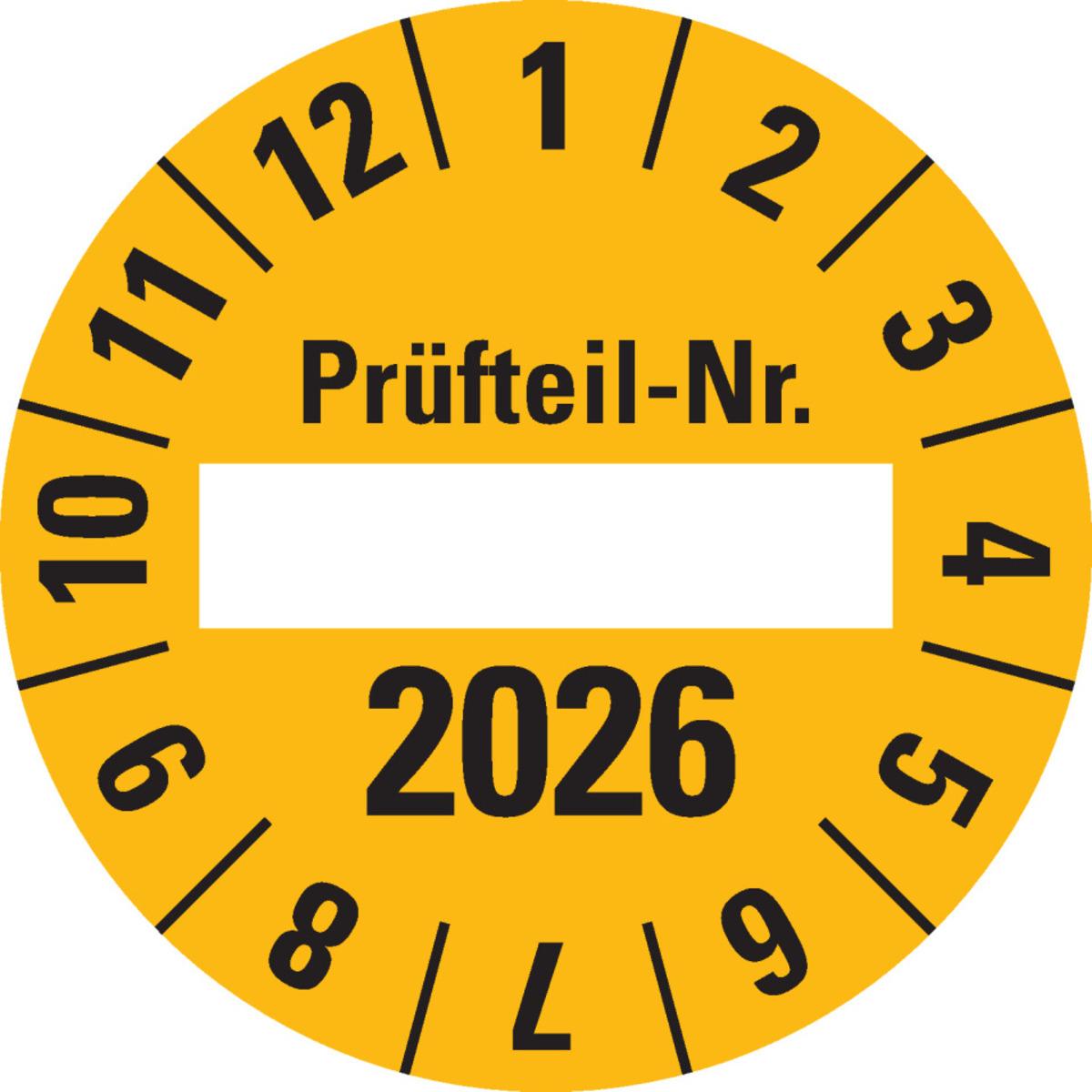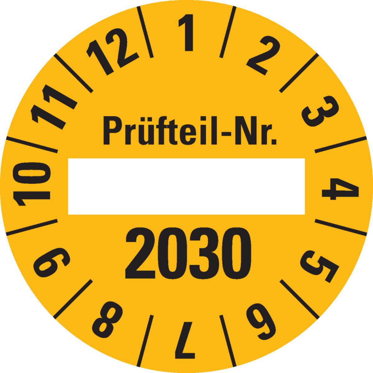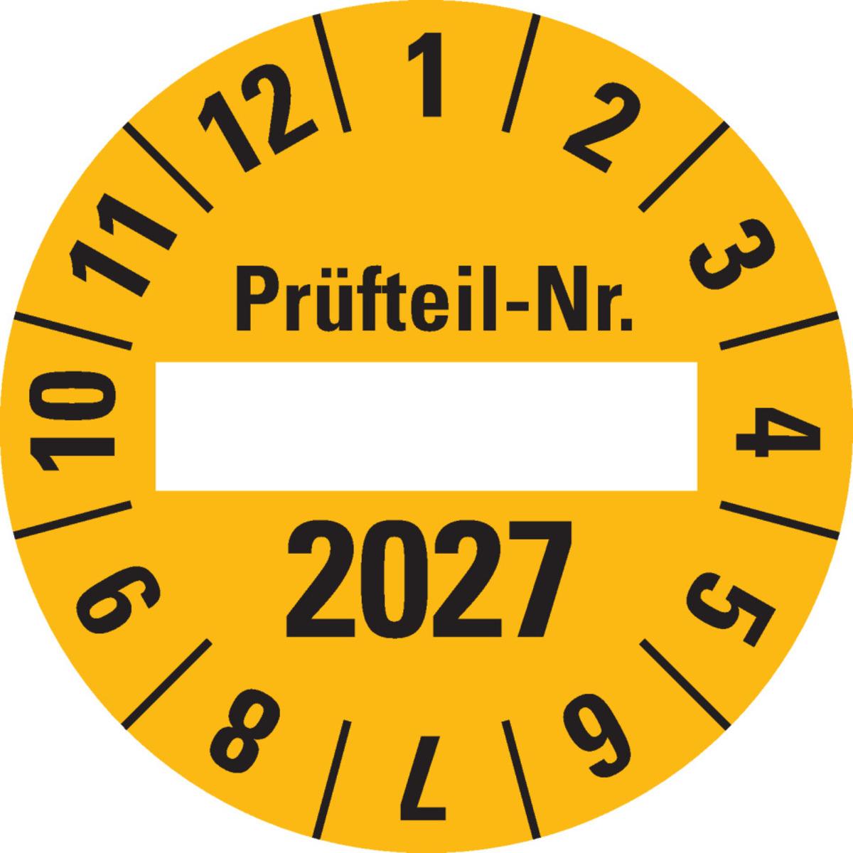 Auswahl: Prüfplakette 2027 Prüfteil-Nr., gelb, Folie, ablösbar, Ø 40mm, 10/Bogen