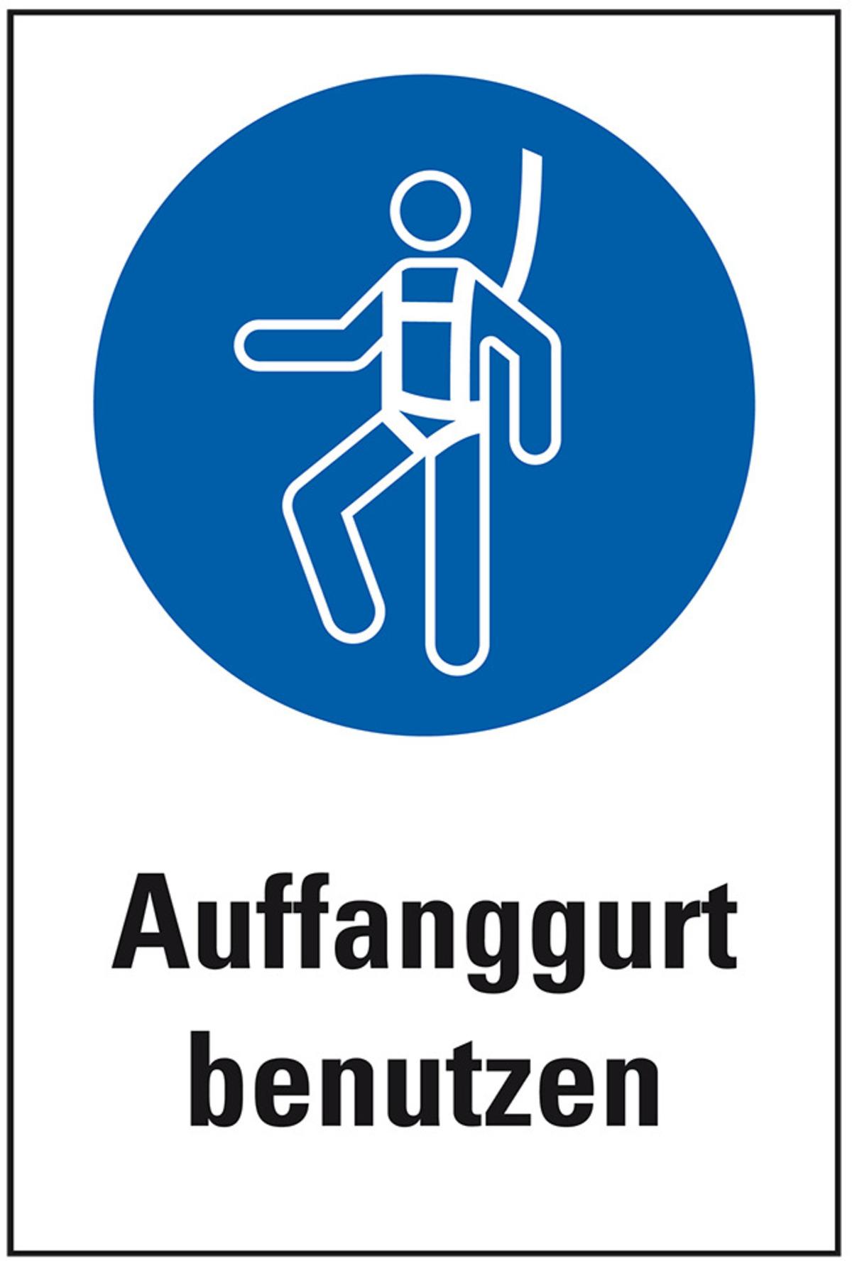Mit dem Kombi-Gebotszeichen "Auffanggurt benutzen" weisen Sie in Text und Bild auf Verhaltenmaßregeln hin, die für mehr Sicherheit zu beachten sind.