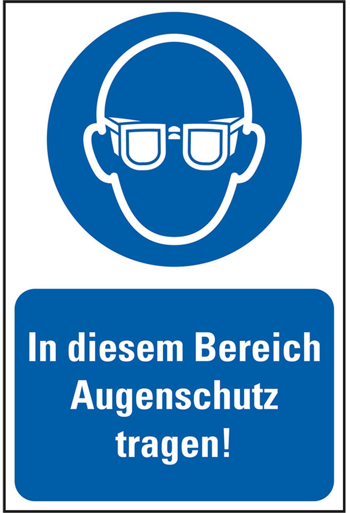 Das Kombi-Gebotszeichen "In diesem Bereich Augenschutz tragen!" weist mittels Piktogramm und Text auf eine wichtige Schutzmaßnahme hin, die an dieser Stelle zu treffen ist.