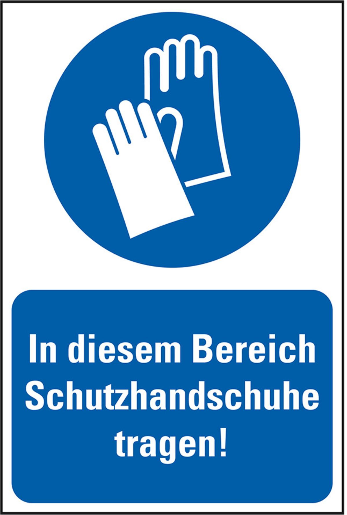 Das Kombi-Gebotszeichen "In diesem Bereich Schutzhandschuhe tragen!" weist mittels Piktogramm und Text auf eine wichtige Schutzmaßnahme hin, die an dieser Stelle zu treffen ist.