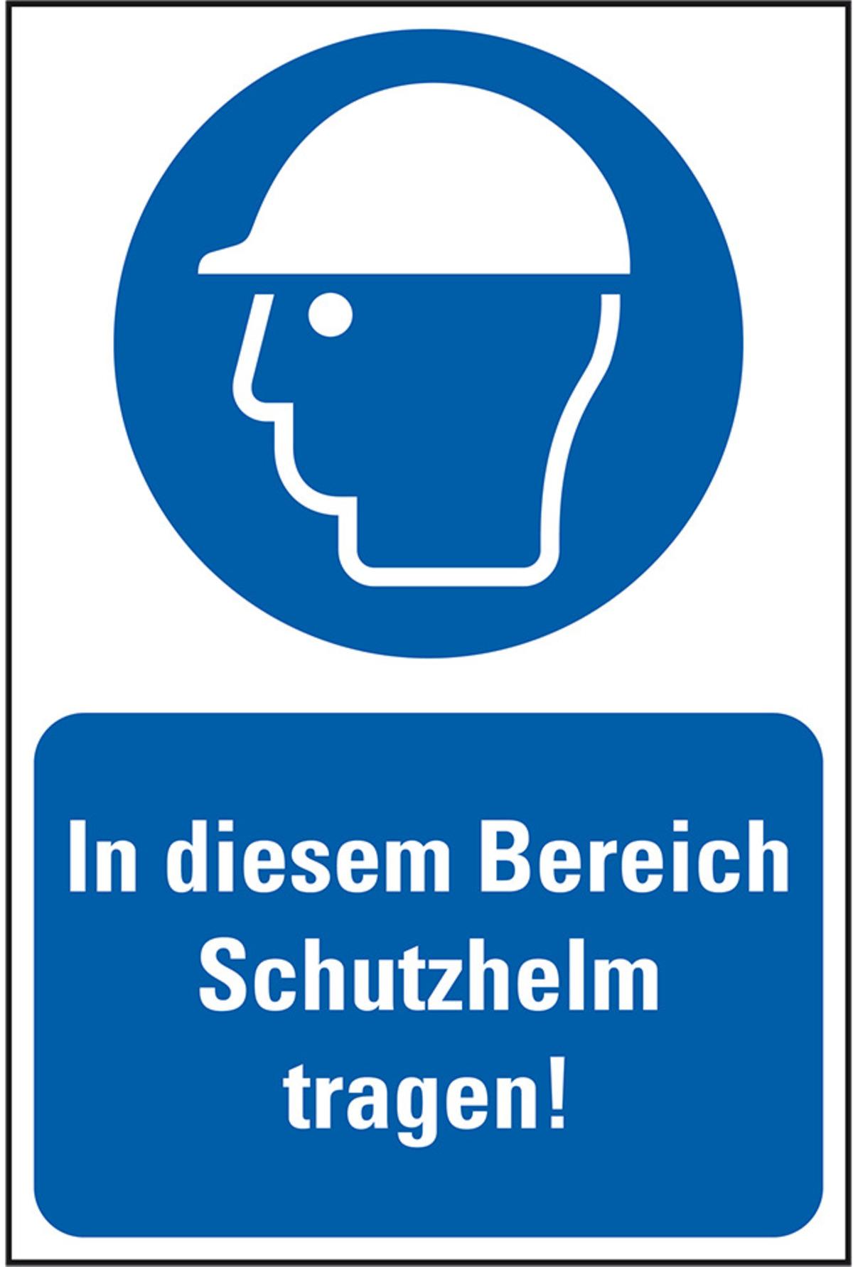 Das Kombi-Gebotszeichen "In diesem Bereich Schutzhelm tragen!" weist mittels Piktogramm und Text auf eine wichtige Schutzmaßnahme hin, die an dieser Stelle zu treffen ist.