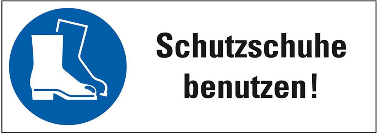 Das Kombi-Gebotszeichen "Schutzschuhe benutzen!" weist mittels Piktogramm und Text auf eine wichtige Schutzmaßnahme hin, die an dieser Stelle zu treffen ist.