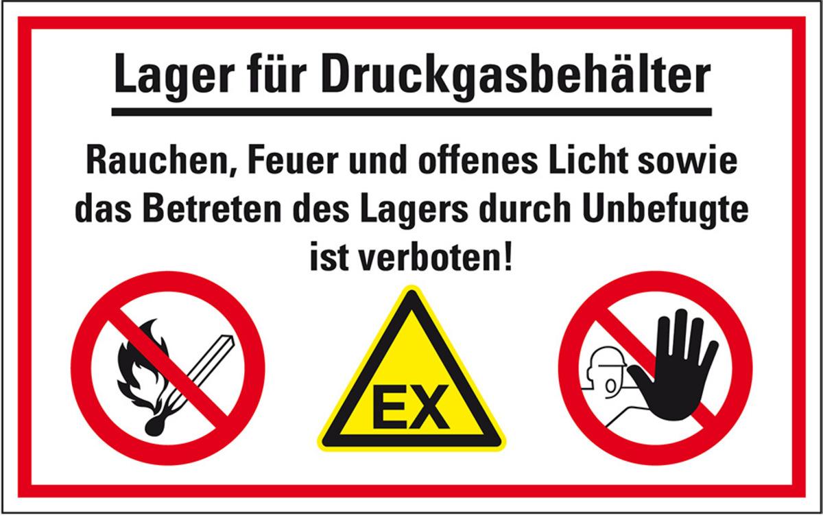 Das Kombi-Hinweisschild "Lager für Druckgasbehälter" weist mittels Piktogrammen und Text auf Gefahren und Verbote hin, die an dieser Stelle zu beachten sind.