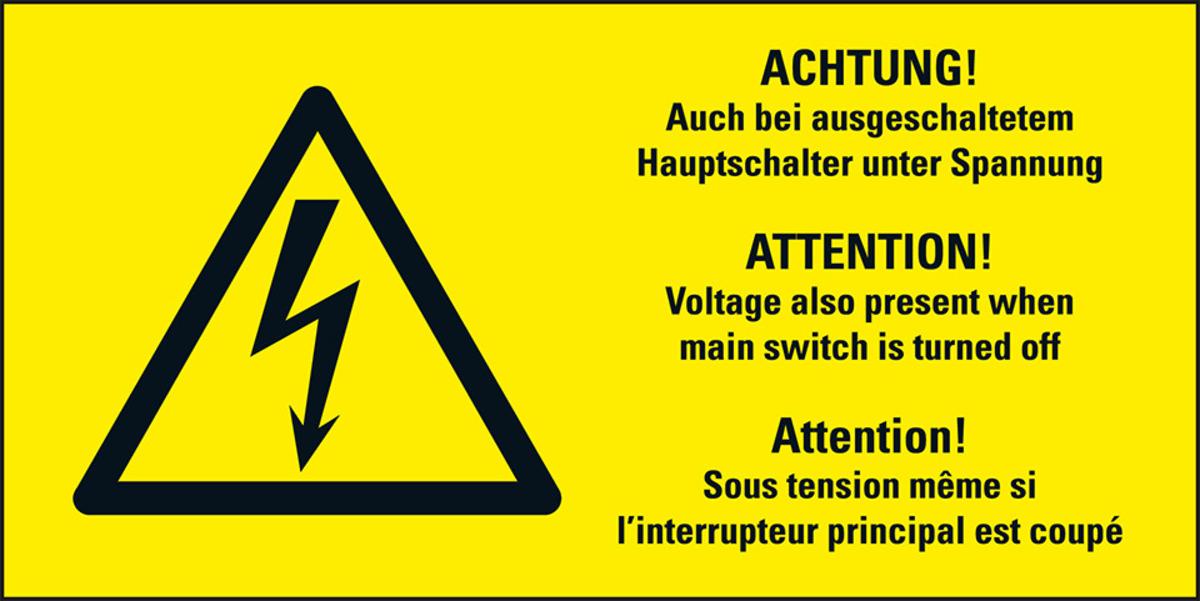 KSIGN Kombi-Warnschild ACHTUNG Auch bei ausgeschaltetem Hauptschalter unter Spannung praxisbewährt