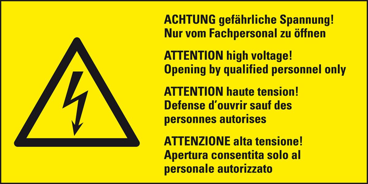 KSIGN Kombi-Warnschild ACHTUNG gefährliche Spannung Nur vom Fachpersonal zu öffnen deutsch, englisch, französisch, spanisch praxisbewährt