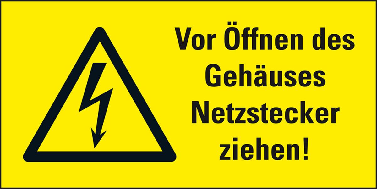 Gefahren müssen gut sichtbar gekennzeichnet werden. Mit dem Kombi-Warnschild "Vor Öffnen des Gehäuses Netzstecker ziehen!" weisen Sie in Wort und Bild auf bestehende Gefahren hin und tragen so zum Schutz Ihrer Mitarbeiter, Besucher und/oder Passanten bei.