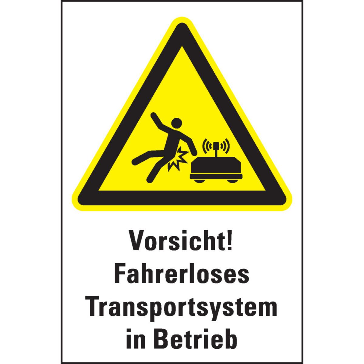 Gefahren müssen gut sichtbar gekennzeichnet werden. Mit dem Kombi-Warnschild "Vorsicht! Fahrerloses Transportsystem in Betrieb" weisen Sie in Wort und Bild auf bestehende Gefahren hin und tragen so zum Schutz Ihrer Mitarbeiter, Besucher und/oder Passanten bei.