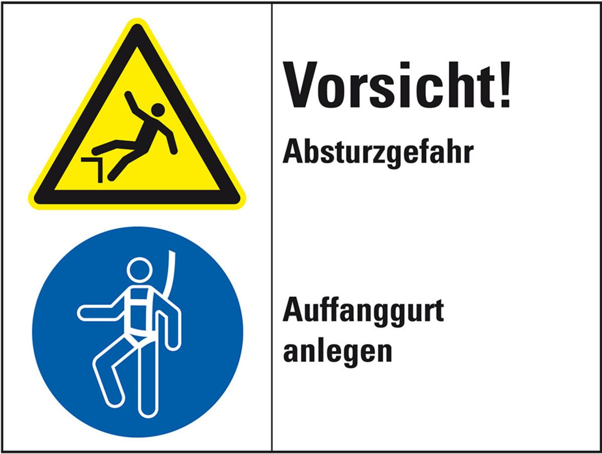 Mit dem Kombischild "Vorsicht! - Absturzgefahr" und "Auffanggurt anlegen" weisen Sie in Text und Bild auf Gefahren und Verhaltensmaßregeln hin. Durch die Kombination aus Piktogramm und Text ist das Schild besonders gut verständlich.